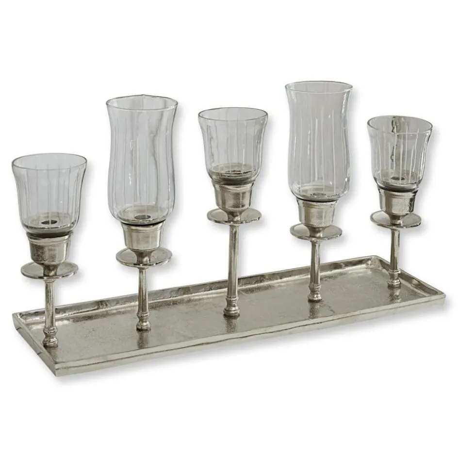 Dieses luxuriöse Accessoire ist ein echtes Statement mit Nostalgie-Charme. Das große, wunderschöne Kerzentablett besteht aus edlem Aluguss mit typischer Struktur und feinem Glas. Die gläsernen Elemente sind mit zarten Rauten- und geraden Schliffen verziert, die für eine Extraportion Vintage-Flair sorgen. Darin finden Teelichter oder Stabkerzen Platz, welche ein kleines Lichtermeer in Ihre Räume zaubern. So eine gemütliche Illumination macht einfach jeden Tag schöner und Ihre Räume so richtig heimelig. Auf dem Tablett können Sie zusätzlich kreative Deko-Arrangements schaffen, vielleicht saisonal angepasst, etwa mit Blüten im Sommer, Kürbissen im Herbst und Weihnachtsschmuck im Winter. Oder Sie lassen das elegante Design einfach pur wirken. Alternativ können Sie auch Dekoratives, Schmuck oder Trockenblüten in den Glaskelchen arrangieren, um eine ganz persönliche Note zu genießen.