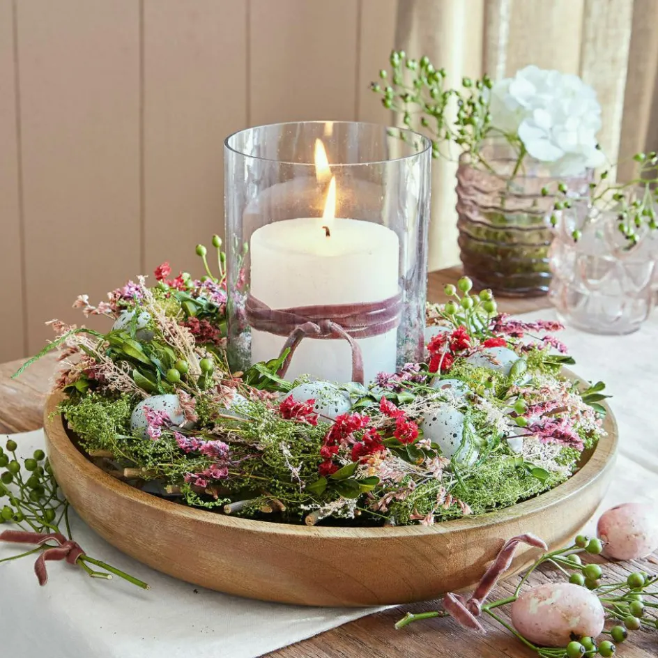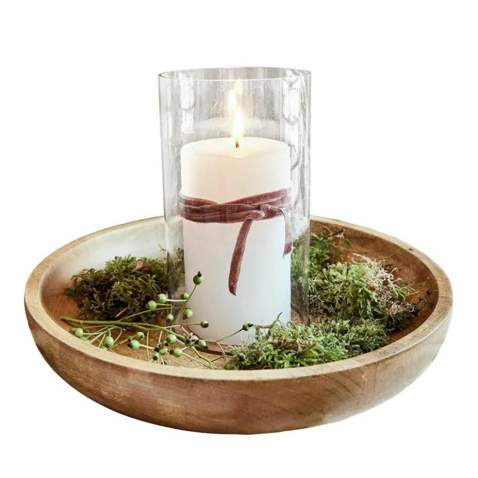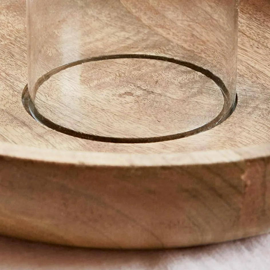 Dieses reizende Design bezaubert mit einem edlen Materialmix aus Mangoholz und einem Zylinder aus Glas. Es lässt sich bestens pur oder individuell dekoriert nutzen, vielleicht mit getrockneten Zitronenscheiben, Muscheln, Trockenblüten und mehr. Werden sie außerhalb des Glases platziert, kann auch nichts in die Flamme geraten. Innen können Sie eine Kerze drapieren und sich so immer über gemütliches Licht freuen. Die Dekoration können Sie auch saisonal immer wieder anpassen, um jederzeit einen ganz persönlichen Akzent in Ihrem Zuhause zu setzen. Der Glaseinsatz steht dank der Vertiefung stabil im Holz und kann einfach abgenommen werden. So kann der Teller auf Wunsch auch einzeln verwendet werden. Auf der Anrichte oder dem Tisch kommt so ein heimeliger und stilvoller Akzent in Ihr Heim, welcher jedem Interieur schmeichelt.