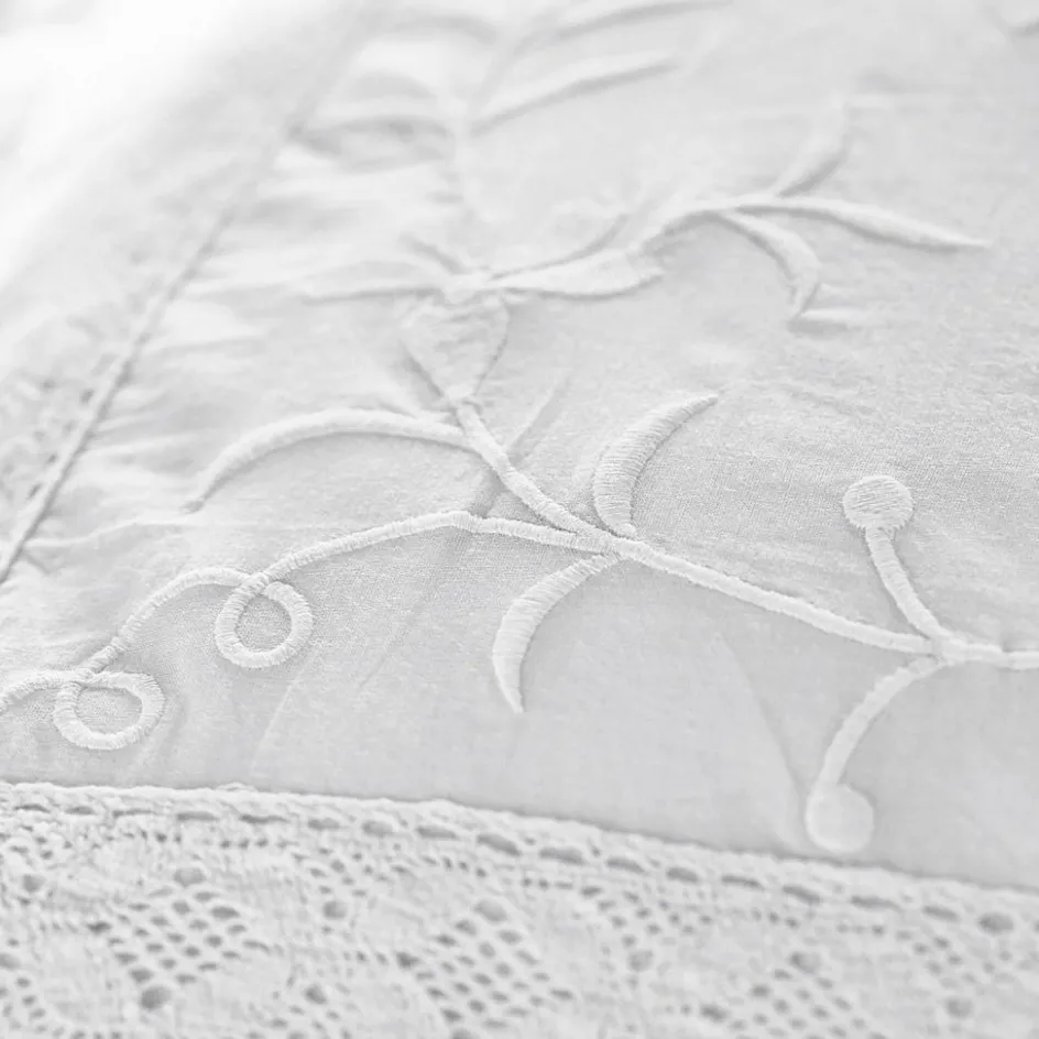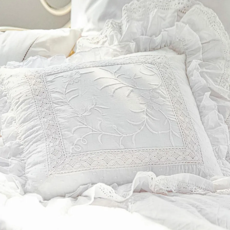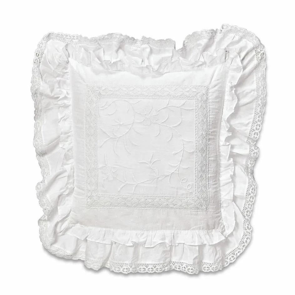 Dieses entzückende Kissen verströmt eine ganz besondere Romantik. Florale Stickereien, fein gehäkelte Details und eine gewellte Borte unterstreichen den klassischen Vintage-Charme. Die luftig gewebte Baumwolle fühlt sich einfach herrlich auf der Haut an. Auf der Rückseite befindet sich der diskrete Reißverschluss, der die Entnahme der formstabilen Füllung ermöglicht.