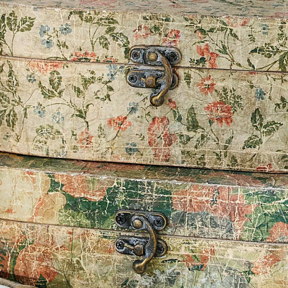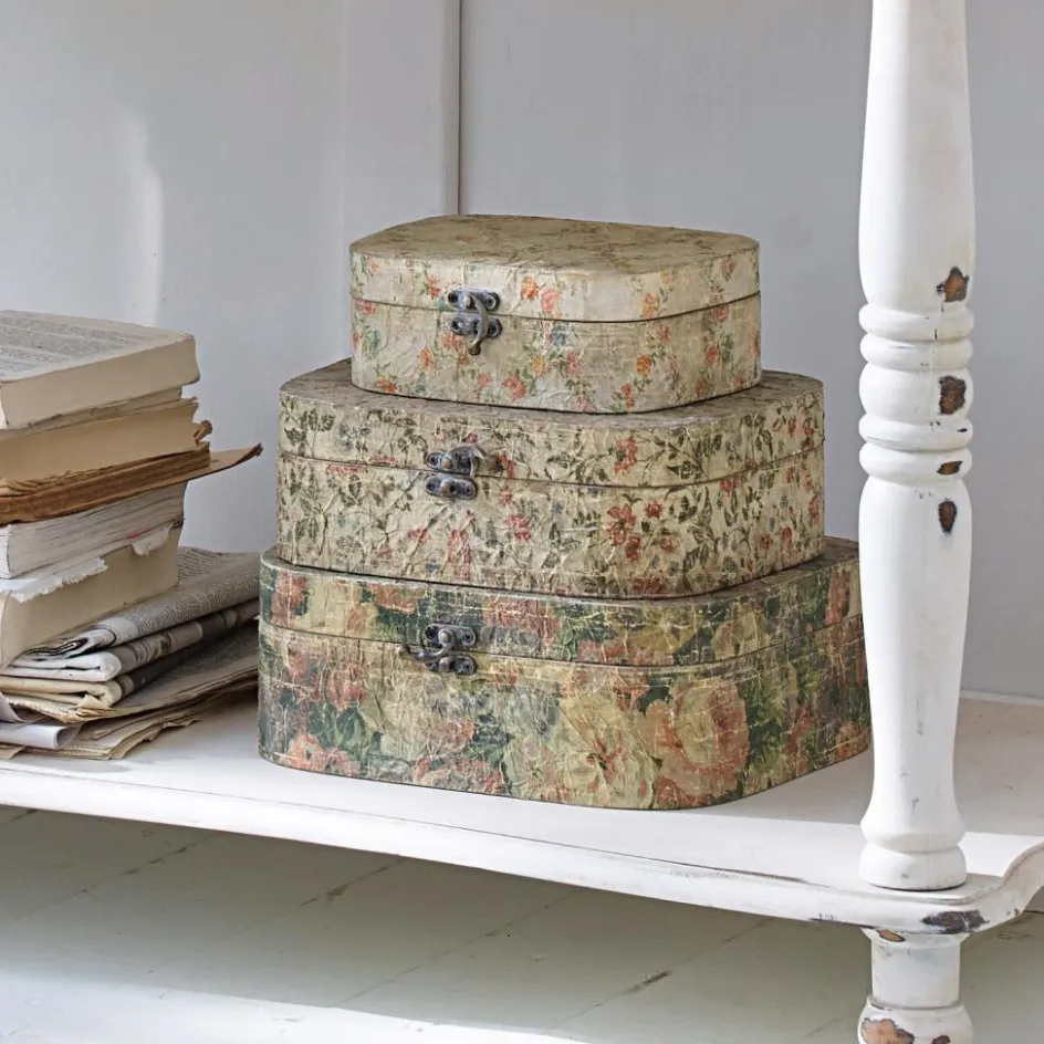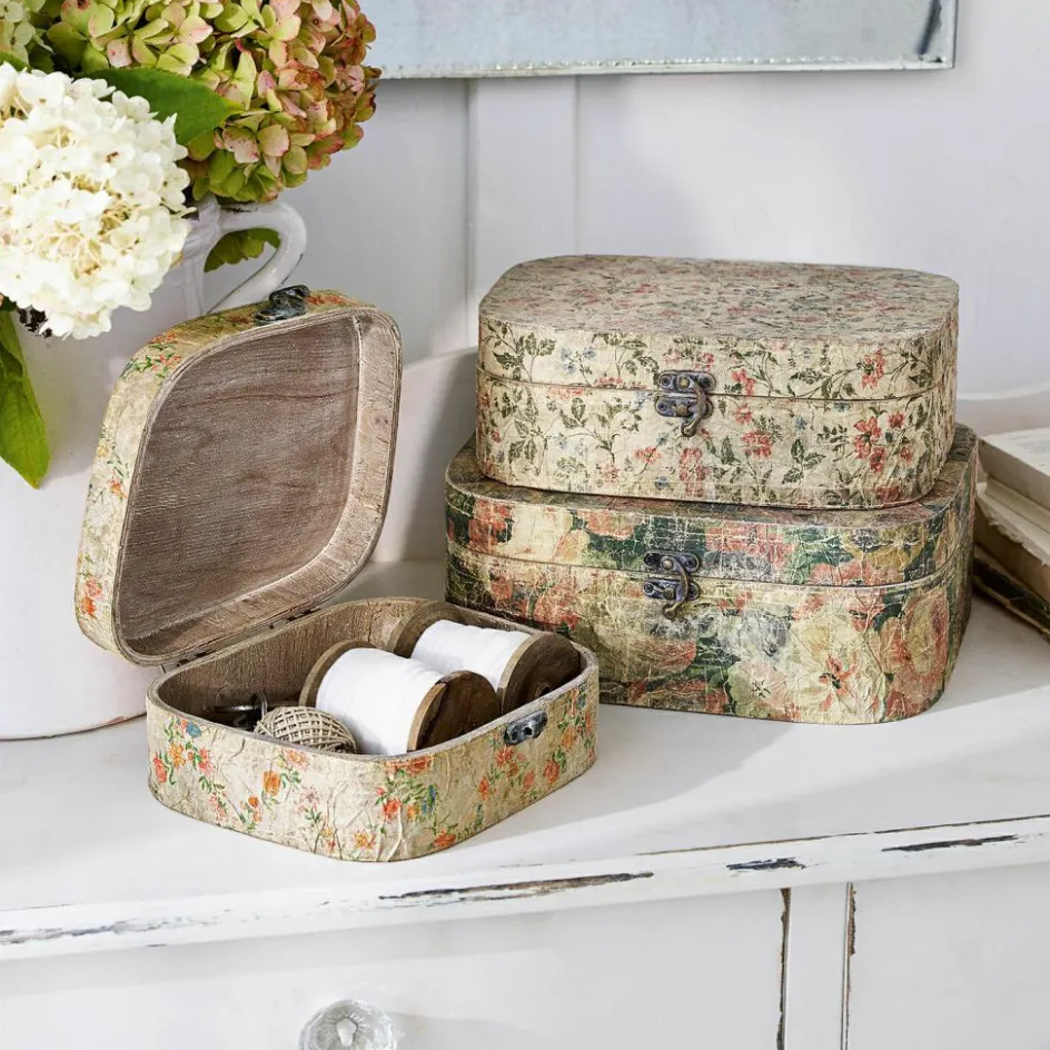 Wie romantische Fundstücke von einem verwunschenen Speicher oder liebgewonnene Andenken wirken diese drei Boxen mit Shabby-Chic-Flair. Sie bezaubern mit sehr authentischem Antik-Look und erscheinen wirklich wie aus einer anderen Zeit. Drei unterschiedliche Größen befinden sich im Set. Einzeln oder als Gruppe, vielleicht dekorativ übereinander gestapelt: Selten sah Stauraum so hübsch aus. Die Behältnisse können übrigens stehend oder liegend arrangiert werden. Ob Briefe, Tagebücher, Schmuck, Fundstücke aus der Natur oder ein Teddy aus Kindertagen, darin finden kleine Gegenstände wunderbar Platz. Ein schönes Detail ist das fein gearbeitete Schloss. Die handlichen Truhen, die ein wenig an Vintage-Schmuckboxen erinnern, bestehen aus MDF. Die Oberfläche ist aus bedrucktem Papier. Der zarte Print mit Blüten-Ranken entführt uns in eine Ära, die lange zurückliegt. Für alle Romantiker, die gerne von früher träumen und sich eine äußerst schmückende Form der Aufbewahrung wünschen, ist dieses 3er Set einfach perfekt.