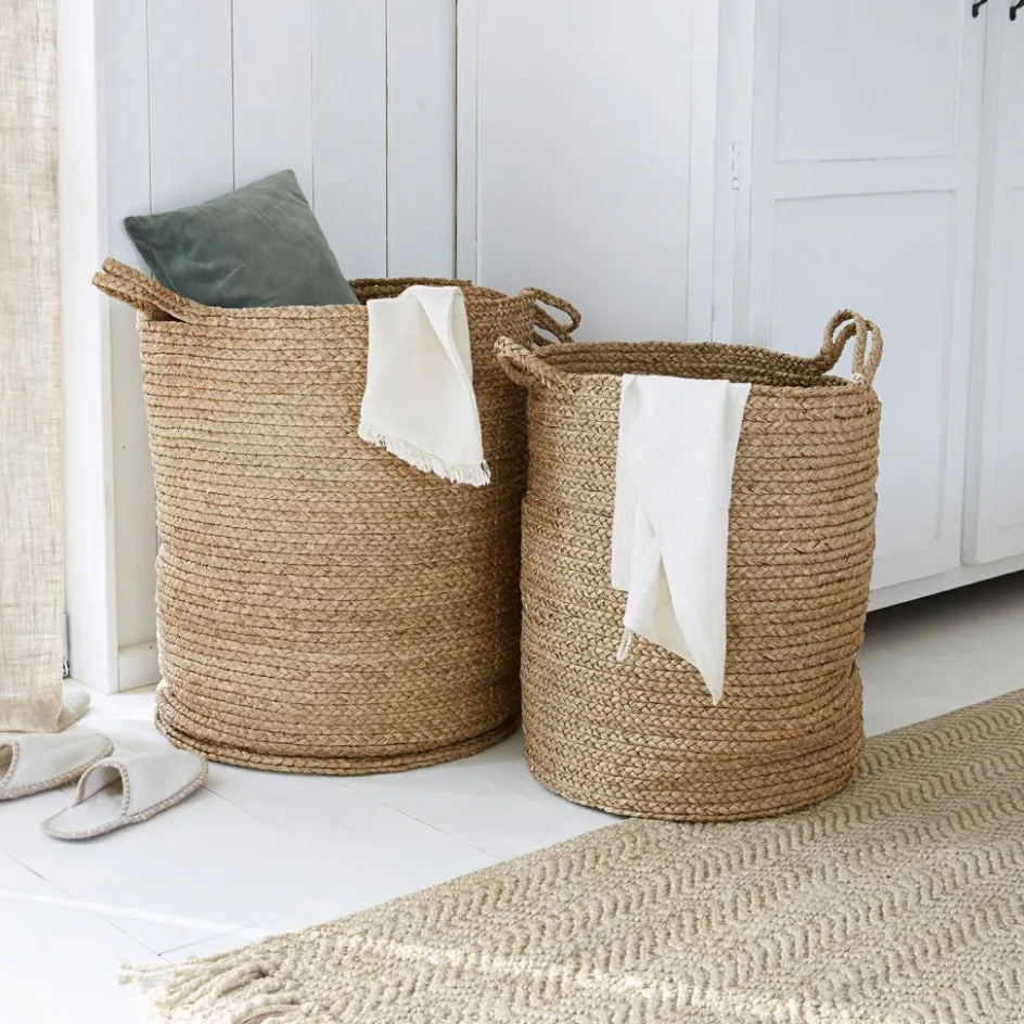 Ein sehr dekoratives Duo, das aus natürlichem Seegras geflochten wurde – ein biegsames, softes Naturmaterial. Beide Modelle eignen sich ideal für Wäsche oder zur Aufbewahrung anderer kleiner Gegenstände. Im Set erhalten Sie zwei Größen. Die naturnahe Anmutung setzt einen schönen Akzent. Ob im Bad, im Flur oder in jedem anderen Raum – so wird es ganz leicht allerlei Kleinkram stilvoll zu organisieren. Ob Sie im Flur beispielsweise Hundeleinen hineinlegen, Handtücher darin verstauen oder Spielsachen darin verwahren: die Möglichkeiten sind sehr vielseitig. Als klassischer Wäschesammler sind eines oder beide Modelle wunderbar in einer Waschküche oder im Wäscheraum einsetzbar. Dank der Henkel lassen sie sich ganz leicht herumtragen. Aufgrund der recht großzügigen Maße fassen sie größere Mengen, gleich welchen Inhalts.