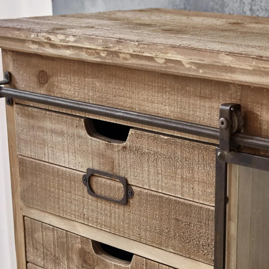 Ein Schmuckstück mit viel Retro-Charme, das an die Aktenschränke vergangener Jahrhunderte erinnert. Hier finden Unterlagen, aber auch künstlerische Accessoires wie Papier und Pinsel und viele weitere Dinge jede Menge Platz. In sechs Schubladen und vier Fächern mit drei Einlegeböden lässt sich alles Mögliche wunderbar ordentlich verstauen. Hinter der Schiebetür aus Glas und Eisen kommen dekorative Accessoires besonders gut zur Geltung. Das massive Modell besteht aus nachhaltig wiederaufbereitetem Tannenholz und Kiefernholz. Die Oberfläche ziert ein dezentes Antik-Finish, wodurch die Maserung des Holzes sichbar bleibt. Die feinen Metallbeschläge der Schubladen wirken angenehm nostalgisch. Ein stabiles und sehr solides Möbelstück mit viel Stauraum und zeitlos klassischem Chic, das Sie lange begleiten wird.
