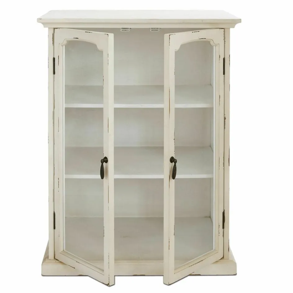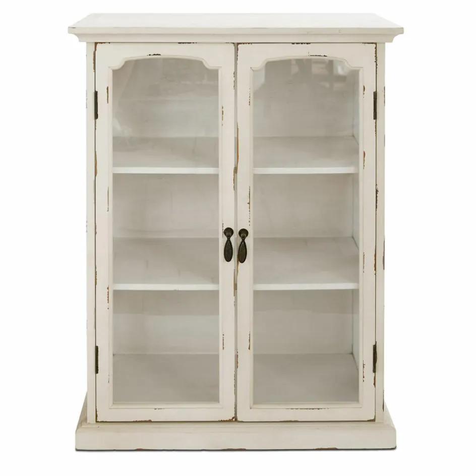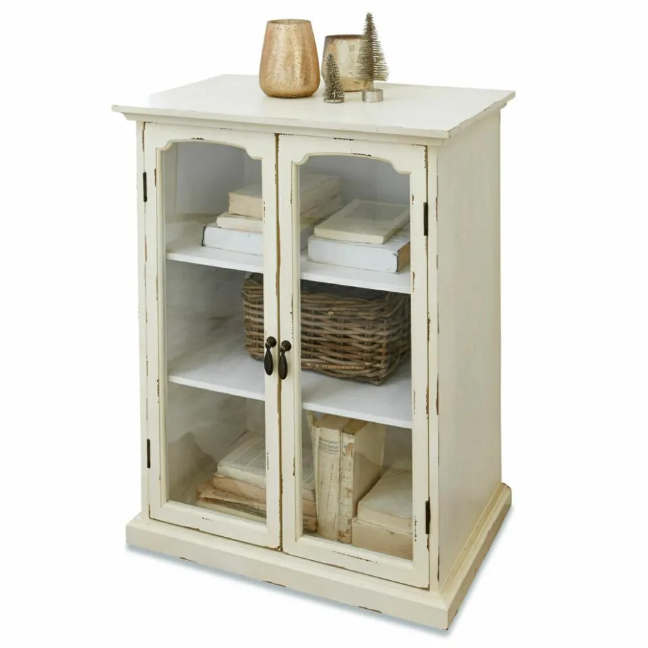Was fasziniert uns eigentlich so an dem Einrichtungstrend, der als Shabby-Chic immer mehr Liebhaber findet? Ist es die Vorstellung, dass die Möbel mit den sichtbaren Gebrauchspuren einen ganz eigenen Charakter haben und uns Geschichten aus vergangenen Zeiten erzählen? Oder dass wir an den kleinen, aber feinen Details erkennen, dass das Möbelstück mit Sorgfalt in bester Handwerksmanier von Hand gefertigt wurde? Wenn diese Kommode vielleicht bald in Ihren vier Wänden steht und Sie auf den stabilen Regalböden hinter den Glastüren Sammlerstücke wie das Kaffeegeschirr der Großmutter oder andere geliebte Deko-Objekte arrangieren, werden auch Sie die nostalgische Ausstrahlung dieser Kommode spüren. Von den geschwungenen Glastüren mit den kunstvoll verzierten Eisengriffen bis zu dem stabilen Podest ist die Kommode ein Schmuckstück, das in jedem Raum einen Hauch Romantik verbreiten wird. Aber nicht nur die dezenten Gebrauchsspuren an den Türen der Vitrine und an den anderen Holzelementen, sondern auch der antike Farbton selbst trägt zum nostalgischen Flair der Kommode bei.