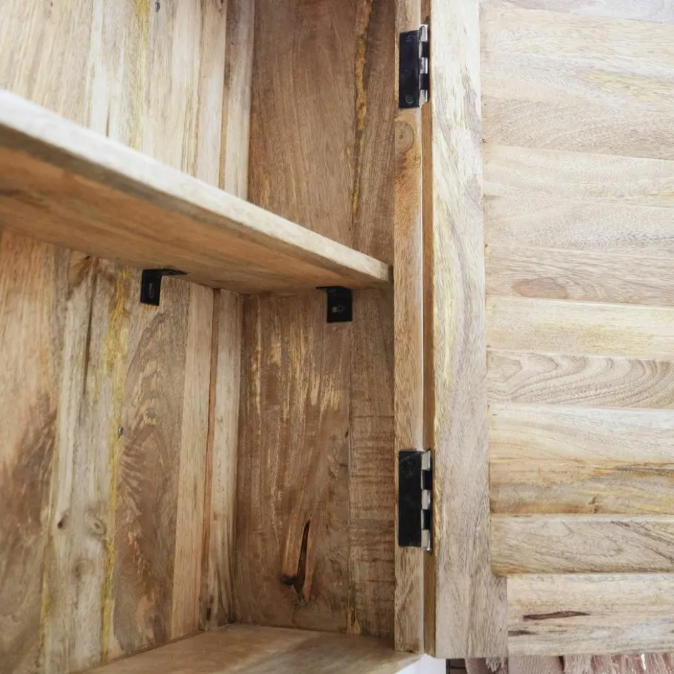Diese Kommode bringt den authentischen Charme des Landhaus-Stils direkt in Ihr Zuhause. Aus massivem Mangoholz gefertigt, besticht sie durch ihre langlebige Qualität und die weiß gekalkte Oberfläche, die einen Hauch von Vintage-Flair verleiht. Die charakteristischen Lamellentüren mit ihrem originellen, praktischen Verschluss fallen sofort ins Auge und bieten zusammen mit den drei geräumigen Schubladen ausreichend Stauraum für Ihre Alltagsgegenstände. Ob im Wohnzimmer, Flur oder Schlafzimmer – dieses Möbelstück verleiht jedem Raum eine gemütliche und einladende Atmosphäre. Die Kombination aus rustikaler Ästhetik und praktischer Funktion macht diese Kommode zu einem unverzichtbaren Begleiter im Landhaus-Stil.