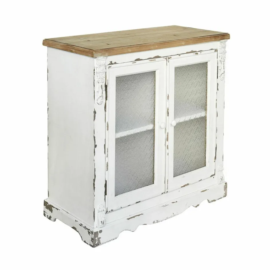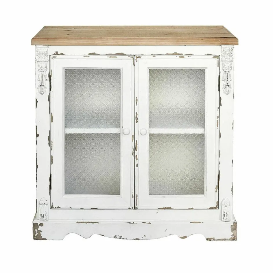 Möbel mit Vintage-Flair öffnen uns den Blick in die Vergangenheit. Wir sehen, wie diese Kommode vielleicht in einem großen Landhaus steht und eine elegant gekleidete Dame die Türen der Kommode öffnet, um etwas hineinzulegen oder herauszunehmen. Oder schauen Sie in die Schreinerwerkstatt und beobachten, wie der Handwerker die Kommode ganz traditionell von Hand baut und verziert, bis er zum Schluss den Korpus antikweiß lackiert? Lassen Sie ruhig Ihre Gedanken ein wenig spazieren gehen, während Sie die Kommode bei sich zu Hause betrachten. Immer mit dem Wissen, dass die liebenswerten Shabby-Spuren und die verspielten Verzierungen heutzutage noch ganz andere Handwerkstechniken erfordern als nur reine Schreinerkunst. Ein besonderes Extra an dieser Kommode sind die Glaseinsätze in den Türen, die dank eines hübschen Ornamentmusters nicht wirklich erkennen lassen, welche Utensilien Sie in den insgesamt vier Fächern dort aufbewahren. Beste Voraussetzungen, wenn Sie nicht immer akribische Ordnung halten möchten.