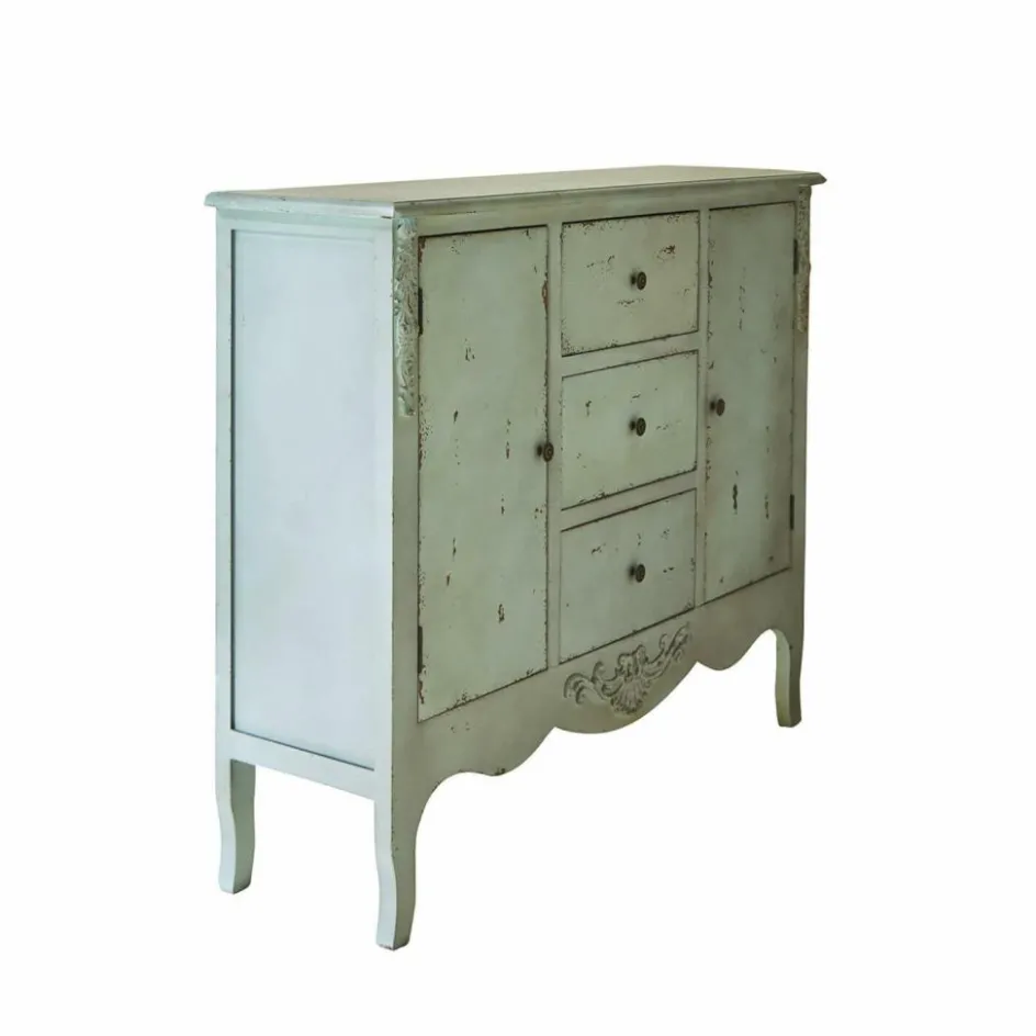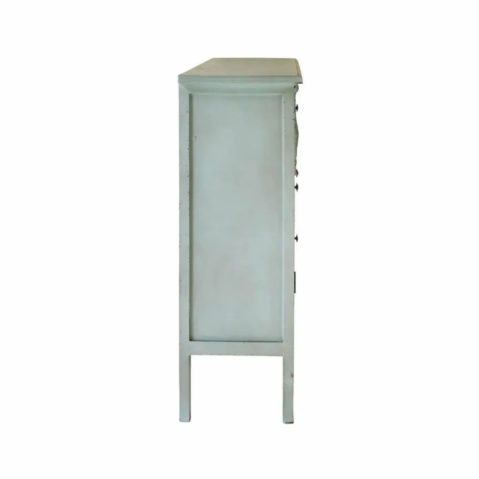 Die aus hochwertigem Tannenholz gefertigte Kommode vereint klassische Formen mit einem modernen, antikblauen Finish. Ihre dezenten Gebrauchsspuren und die handgearbeiteten Verzierungen an der Front erinnern an den zeitlosen Stil des Landhauses. Die glatte, leicht strukturierte Oberfläche lädt zum Berühren ein und strahlt eine beruhigende Wärme aus. Mit drei Schubladen und zwei seitlichen Fächern bietet sie nicht nur großzügigen Stauraum, sondern setzt auch optisch ein Statement in jedem Raum. Ideal für alle, die ihren Wohnbereich mit einem charmanten, rustikalen Möbelstück aufwerten möchten.