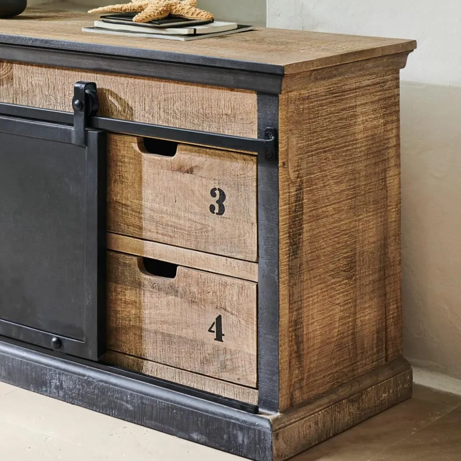 Diese einzigartige Kommode bringt typischen Industrie-Charme in Ihre Wohnwelt. Alte Fabrikmöbel aus den 20er bis 50er Jahren dienten als Vorbild für die Herstellung dieses Möbelstücks. Schwere, gegensätzliche Materialien und spannende Used-Effekte zeichnen den beliebten Trend aus, der gelebte Geschichten auf eindrucksvolle Weise widerspiegelt. Dabei werden handwerkliche Perfektion und der praktische Aspekt nicht außer Acht gelassen. Der Korpus und die Front sind aus massivem Mangoholz gefertigt, während die Rückseite und die Schubladenböden mit strapazierfähiger Holzfaserplatte ausgestattet sind. An den Kanten befinden sich dezente Farbakzente, die zusätzlichen Charme versprühen. Die vier Schubladen sind stilgerecht mit offenen Handgriffen und einem originellen Ziffernaufdruck versehen – groß genug bieten sie ausreichend Stauraum für Tischwäsche und sonstige Wohnaccessoires. Veredelt wird das nostalgisch inspirierte Stück mit zwei variablen Schiebetüren aus Eisen, die von einer Eisenstange geführt werden. Hinter den Türen verbirgt sich jeweils ein Einlegeboden, der für zusätzliche Abstellfläche sorgt. Ein auffallend schönes Möbel, das ganz viel Flair verbreitet.