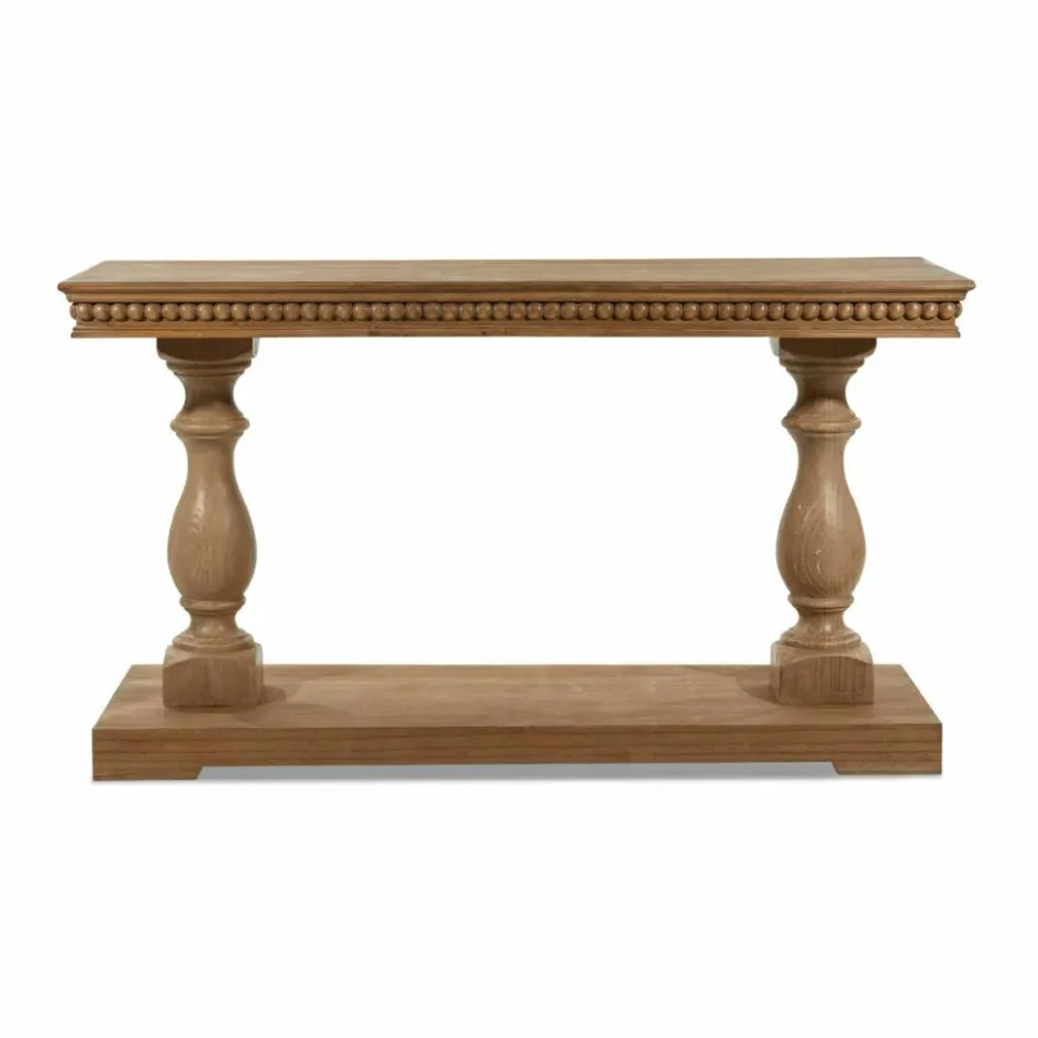 Wie schön, wenn man schon beim Betreten einer Wohnung von einer Atmosphäre stilvoller Wohnlichkeit empfangen wird! Wo schöne Möbel und ausgewählte Accessoires ein stimmiges Potpourri bilden und von der Passion des Eigentümers für wertvolle Naturmaterialien erzählen. In einem solchen Ambiente übernimmt oftmals eine Konsole wie diese hier eine tragende Rolle, die als praktische Ablage für die verschiedensten Dinge dient, zugleich aber ein Genuss fürs Auge ist. Gerne lässt man die Blicke über die vielen liebevoll gearbeiteten Details streifen – von den klassischen Perlstab-Schnitzereien, mit denen der Künstler den Rand der massiven Tischplatte verziert hat, bis zu den aufwendig gestalteten Beinen, die an die imposanten Säulen antiker Gebäude erinnern. Beide Beine sind massiv gearbeitet. Das schöne Kiefernholz wurde mit einem antibraunen Finish veredelt, das den antiken Charakter der Konsole zusätzlich betont.