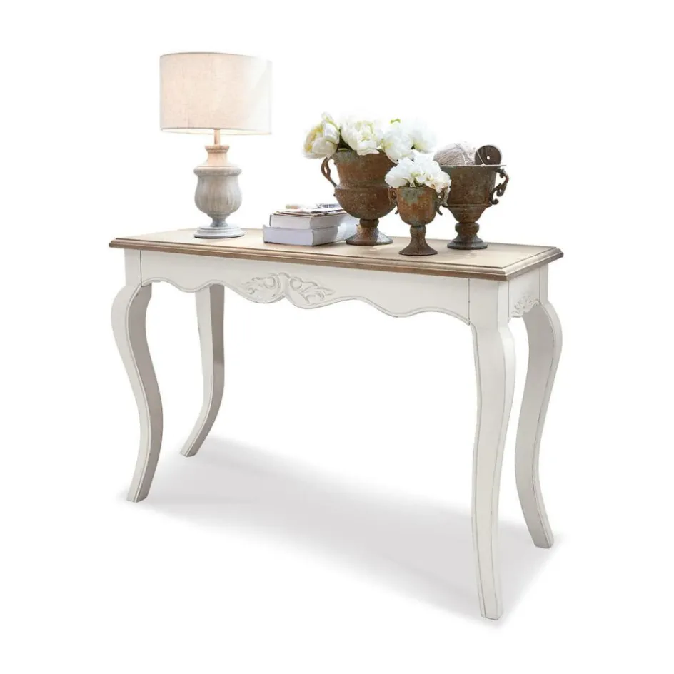 So sieht ästhetische Wohnkultur aus: Diese schöne Konsole ist das Ergebnis vollendeter Handwerkskunst und bezaubert durch ihre eleganten Verzierungen und handgedrechselte Beine. Sie besteht aus widerstandsfähigem Mangoholz und ist mit viel Liebe zum Detail gefertigt. Hier vereint sich schlichte Klassizität mit liebevollen Raffinements. Wer seinem Wohnambiente eine Note Landhausstil geben möchte, greift zu diesem eleganten Möbelstück. Aber natürlich hat die Konsole auch ihre praktischen Funktionen: Auf der Konsolenplatte mit schickem White-Washed-Finish kommen schöne Vasen, Kerzenleuchter, Schatullen, aber beispielsweise auch antiquarische Bücher oder Ihre liebgewonnenen Schmuckstücke wunderbar zur Geltung. Dabei trägt die Konsole, trotz ihrer zarten und eleganten Statur, auch sehr schwere Gegenstände – ausgezeichnete Qualitäten also, in vollendeter Form.