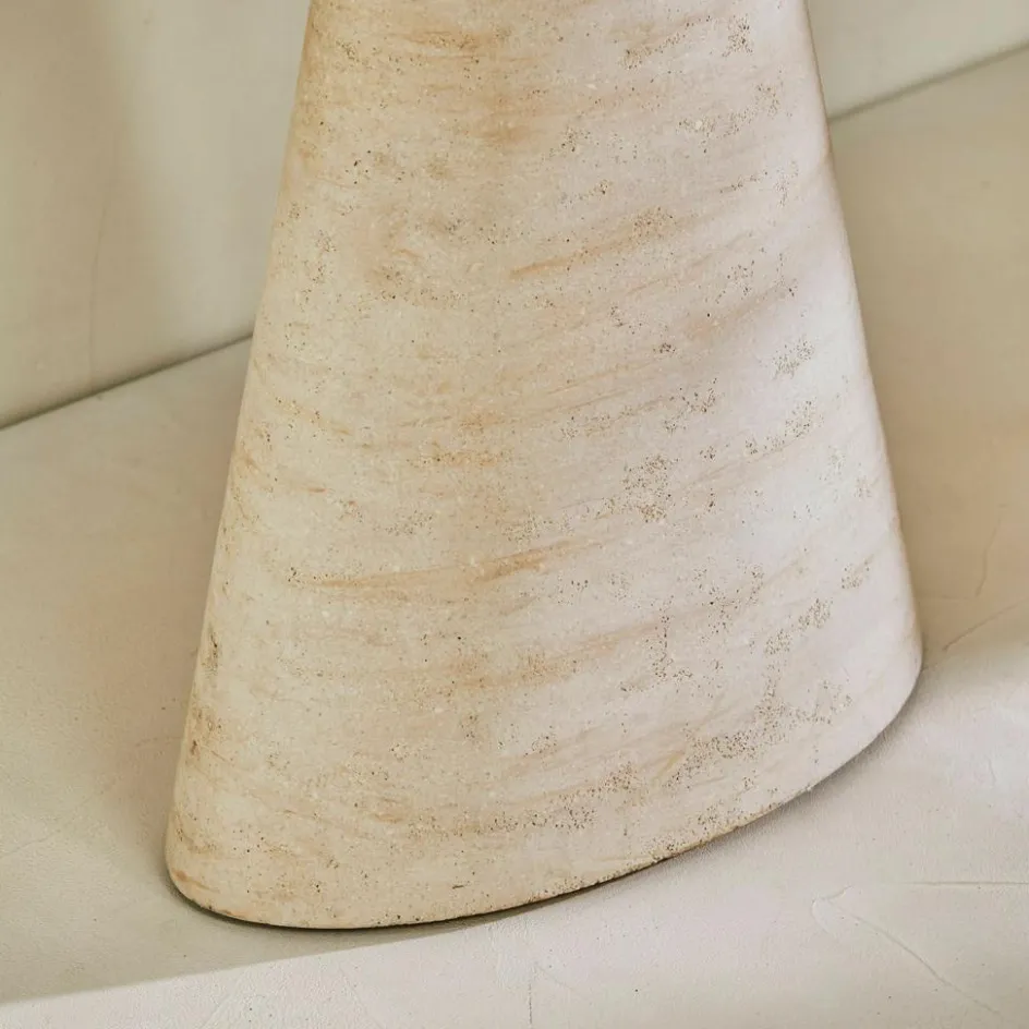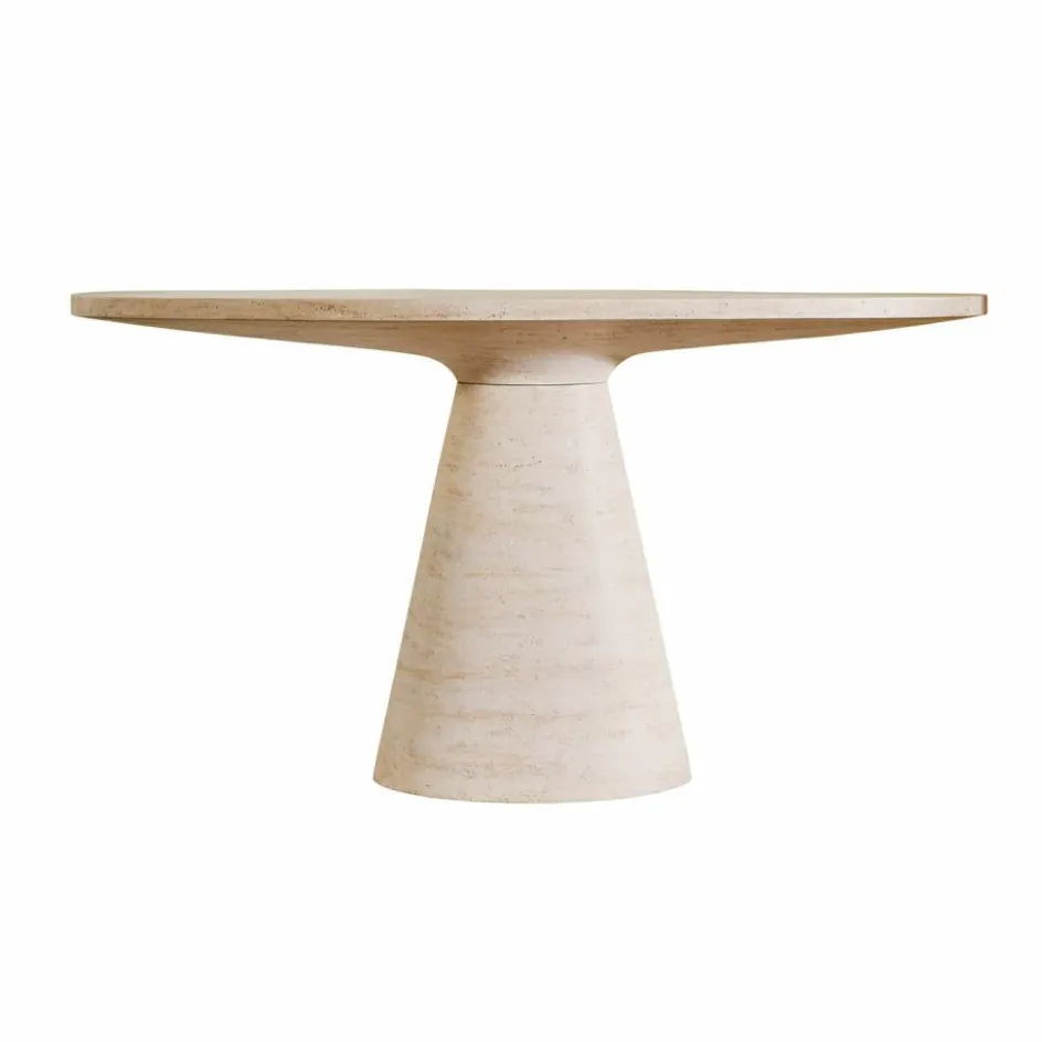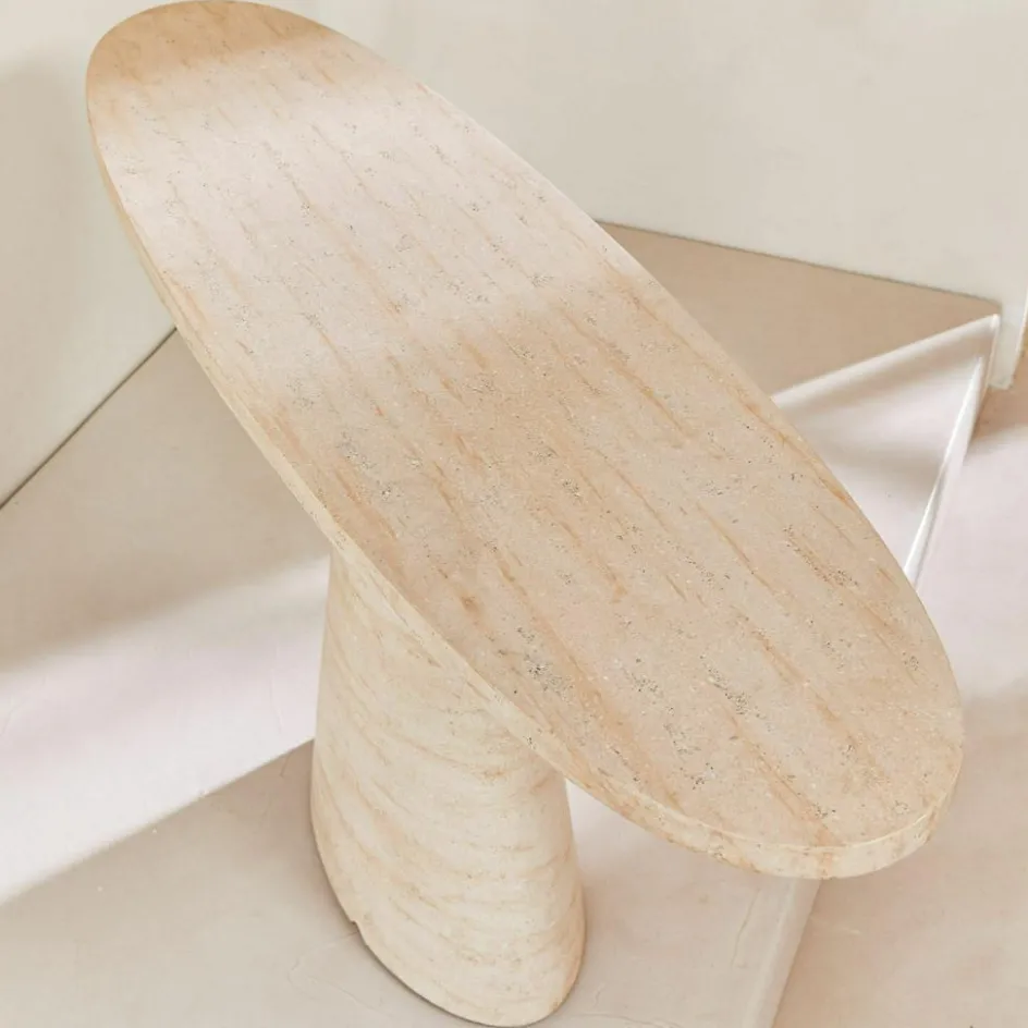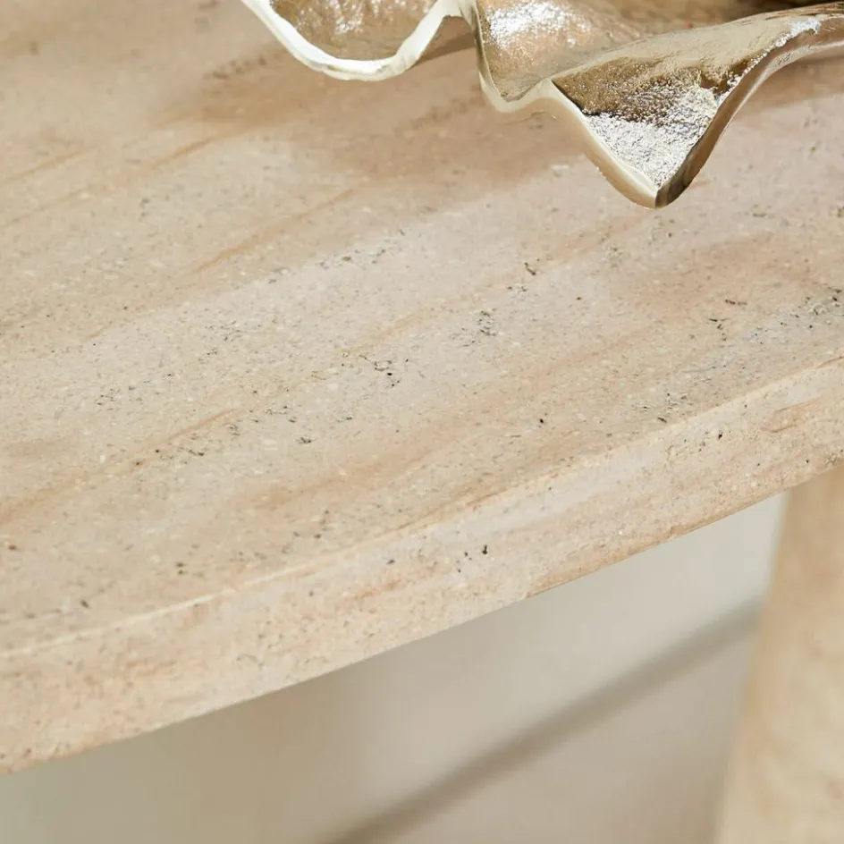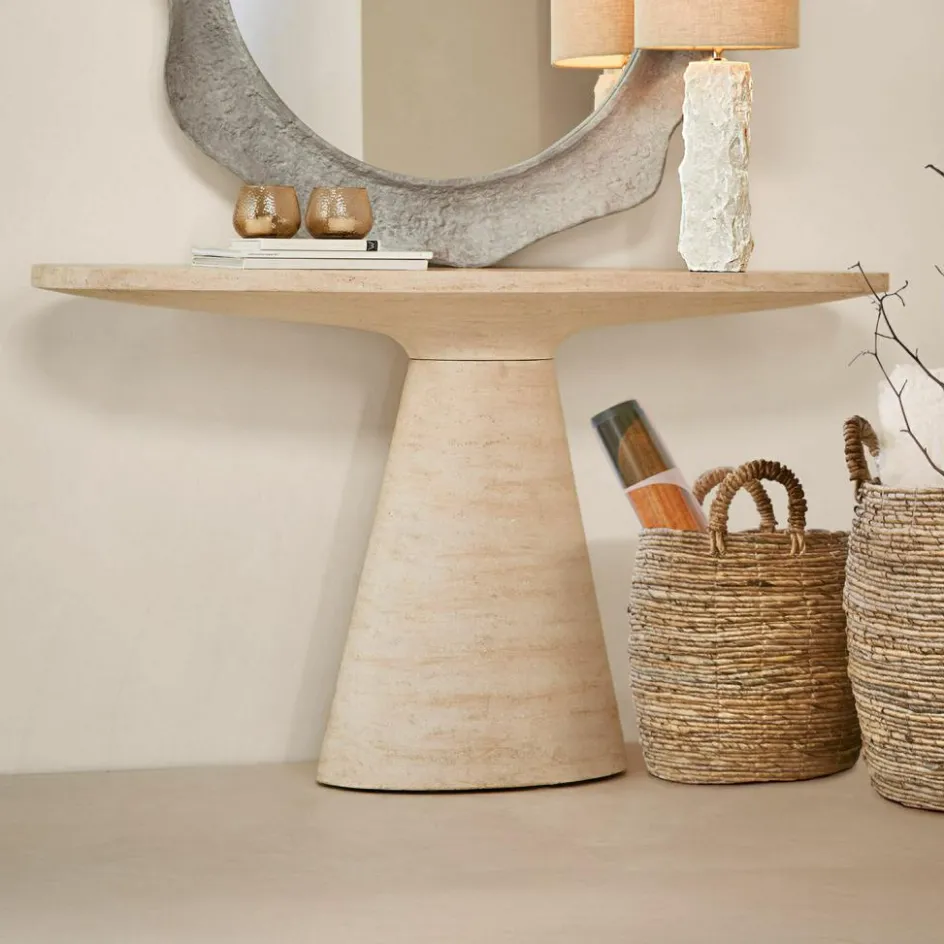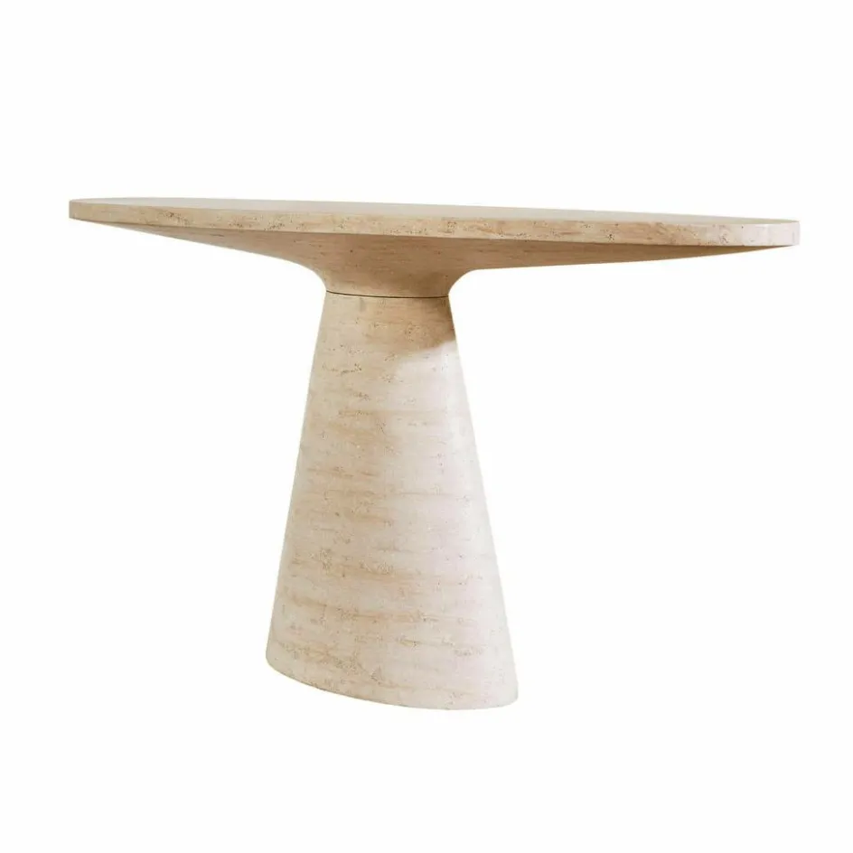 Ein Möbelstück wie ein Statement: Diese Konsole begeistert nicht durch Schnörkel, sondern durch schlichte Schönheit, natürliche Haptik und eine Form, die im Gedächtnis bleibt. Das wiederaufbereitete Travertin erzählt von der Zeit – mit feinen Einschlüssen, zarten Poren und einem Farbspiel aus warmem Beige und erdigem Naturstein. Besonders charaktervoll wirkt das Möbel durch seine ovale Tischplatte, die sich auf einem konisch zulaufenden Sockel erhebt. Die fließende Linienführung lässt die Konsole wie aus einem Guss erscheinen . Ob im Eingangsbereich, als Solitär im Wohnzimmer oder als Podest für besondere Objekte – sie bringt Ruhe, Klarheit und natürlichen Luxus in jeden Raum.