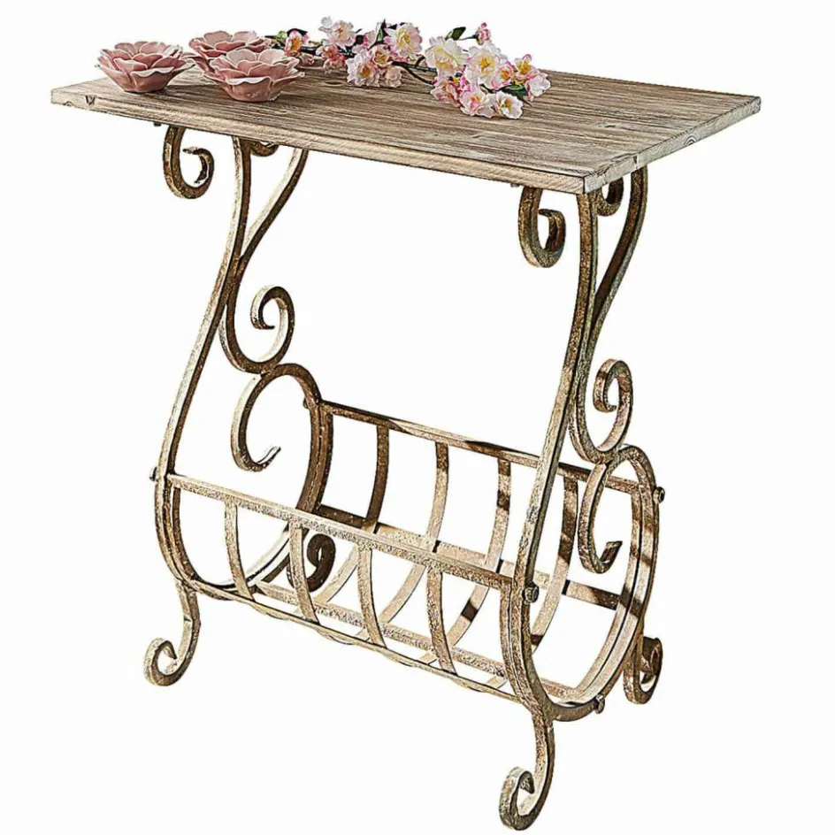 Diese Konsole erzählt eine ganz besondere Geschichte, denn das Design orientiert sich an antiken Nähmaschinentischen. Leider findet man diese ja kaum noch in den Haushalten, aber in diesem hochwertigen Konsolentisch lebt das charakteristische Design weiter. Das Gestell besteht ganz traditionell aus Eisen und schmeichelt dem Auge mit seiner kunstreichen Gestaltung. Die Platte aus natürlich schönem Tannenholz bildet einen charmanten Kontrast zum Eisengestell. Im Fußbereich findet sich eine hübsche Ablage, die vielfältige Möglichkeiten bietet. Darin können Sie verschiedenste Utensilien verstauen oder Ihre Zeitschriften ablegen. So ist die Konsole besonders im Wohn- oder Arbeitszimmer eine gute Idee. Zumal sie auch mit Ihrer gerignen Höhe kaum Platz wegnimmt.