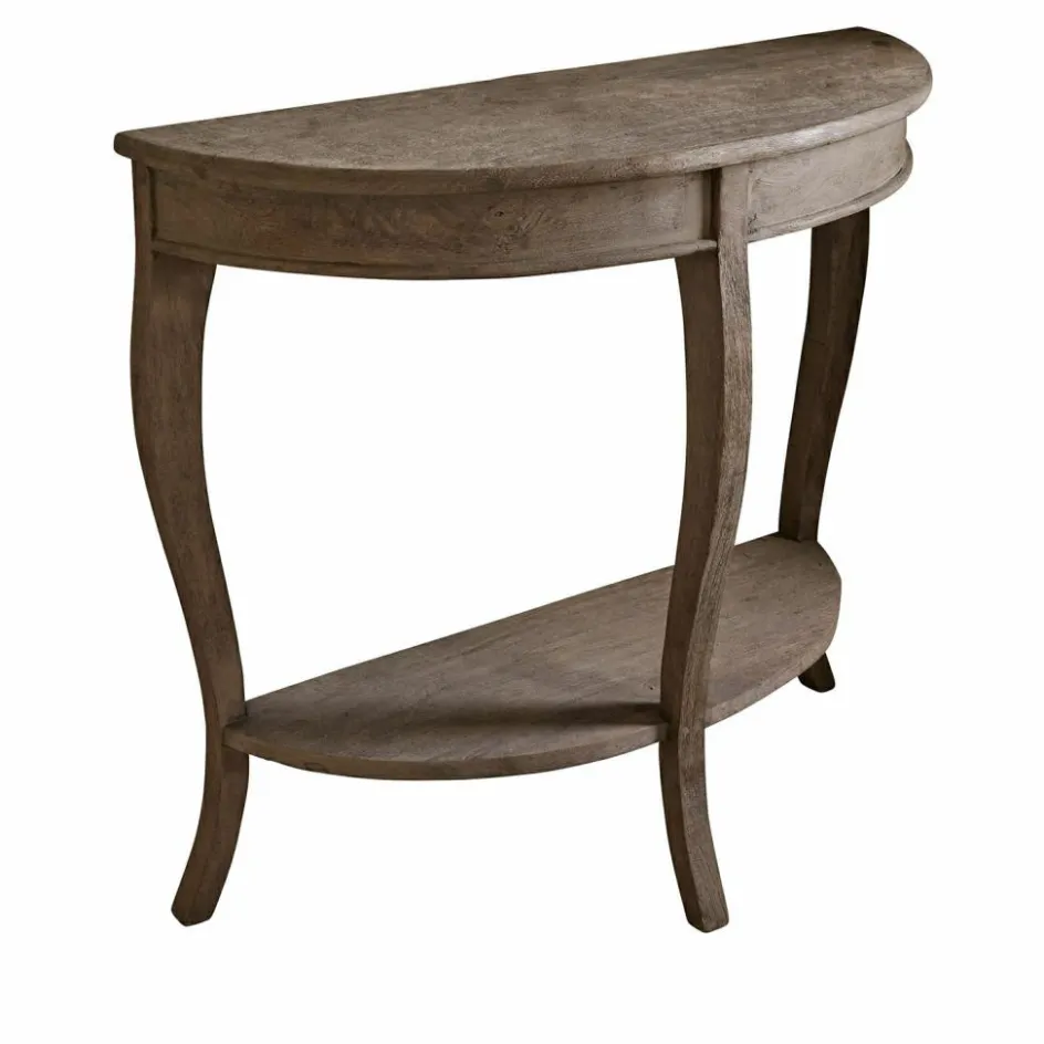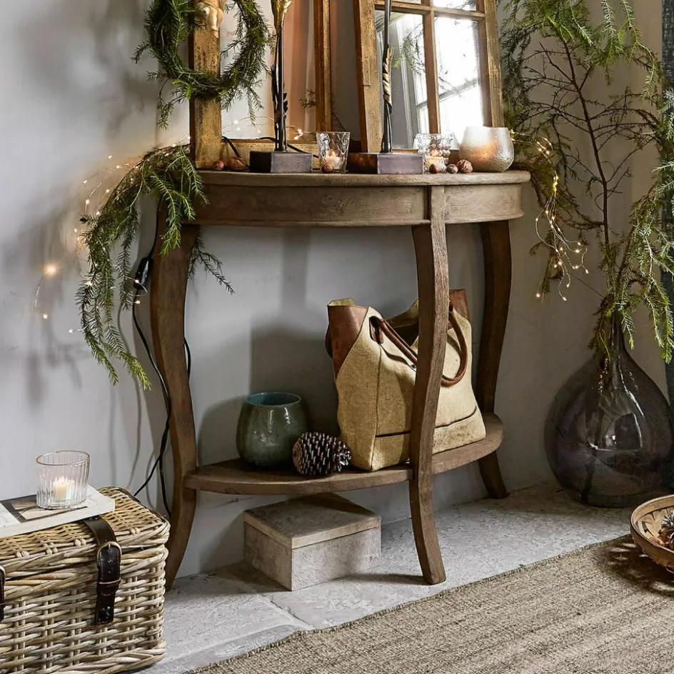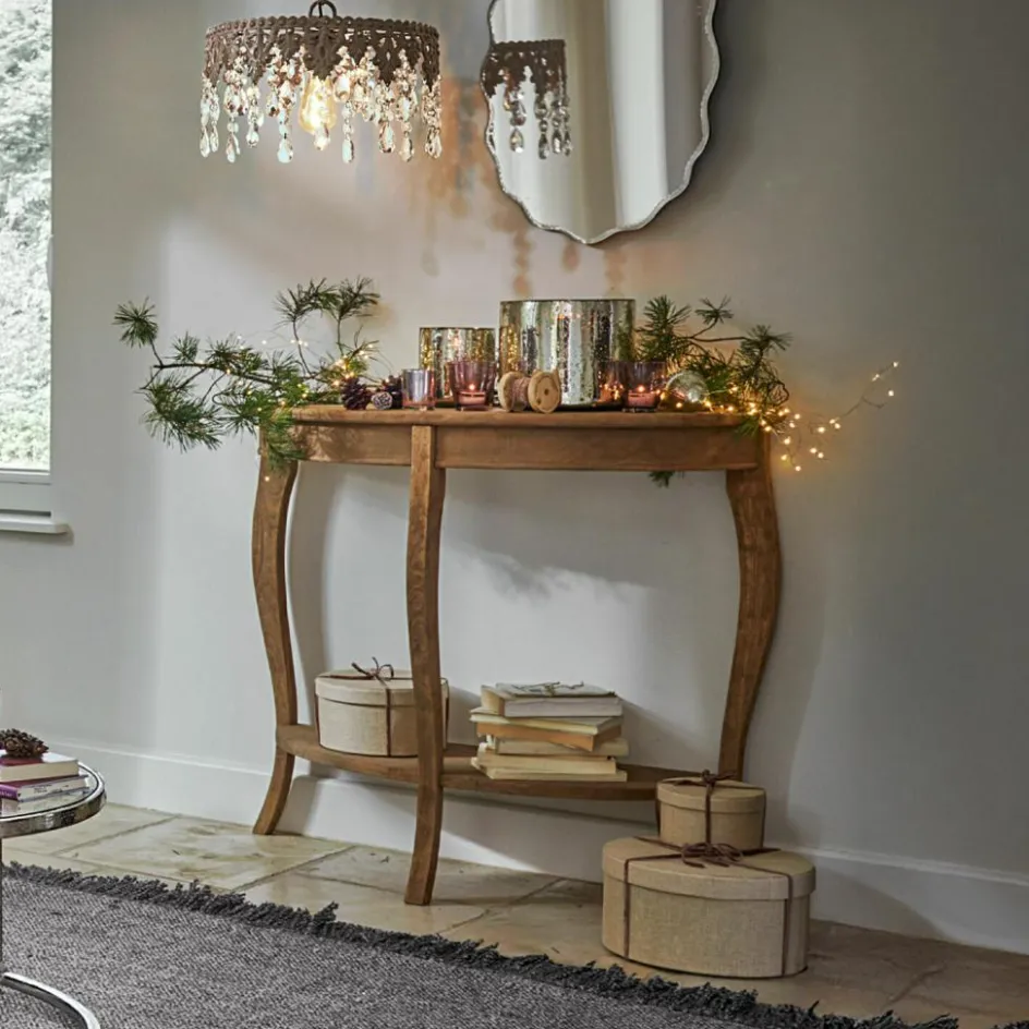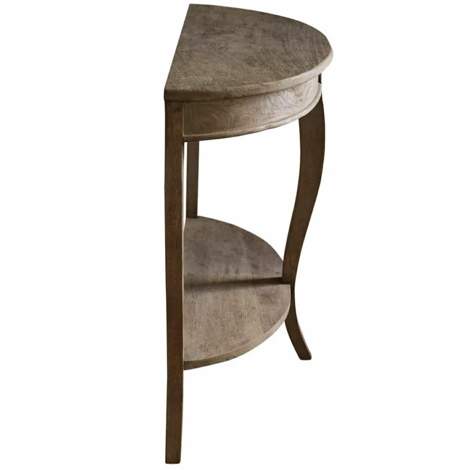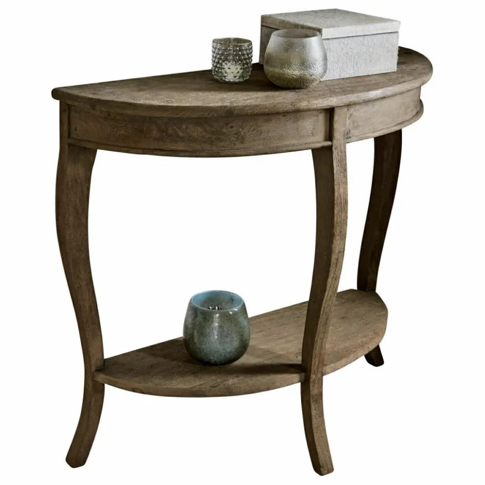 In dieser schönen Konsole vereint sich praktischer Komfort mit nostalgischer Eleganz. Mit ihren beiden Ablagemöglichkeiten sorgt sie für perfekte Ordnung. Besser und schöner können Ihre Utensilien, Ihre Uhr, Ihr Smartphone oder Ihre Brille kaum aufgehoben werden. Aber auch kleine Speisen und Getränke, die Sie neben Ihrem Sofa oder Ihrem Lieblingssessel griffbereit haben möchten, finden auf dem Schmuckstück mit den kunstvoll geschwungenen Beinen ihren perfekten Platz. Oder möchten Sie einfach Ihre zauberhaften Deko-Artikel wie Kerzenleuchter, Bilder oder Blumenvasen präsentieren und ihnen einen besonderen Ort geben? Auf diesem Schmuckstück aus hochwertigem Mangoholz mit seiner faszinierenden natürlichen Maserung ist alles bestens aufgehoben. Ein liebenswerter Blickfang und eine wahrhafte Zierde!