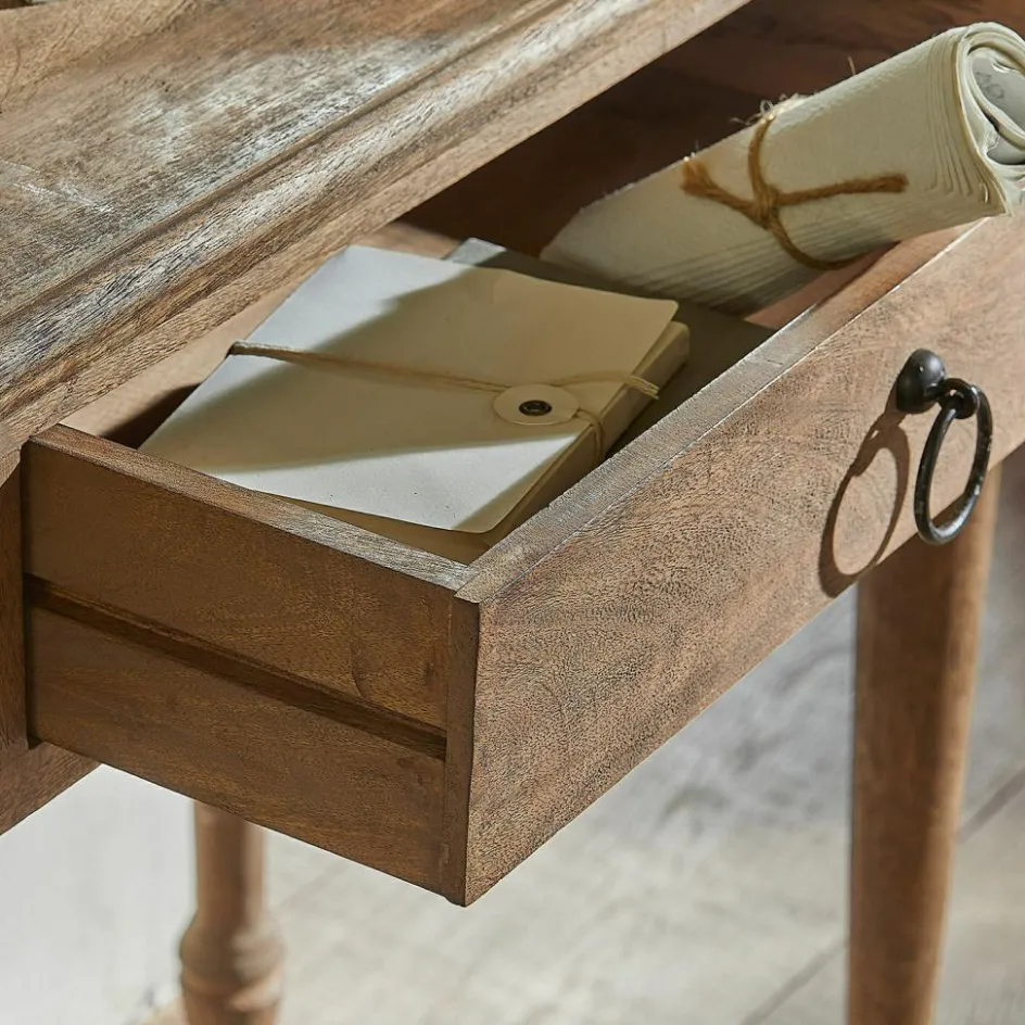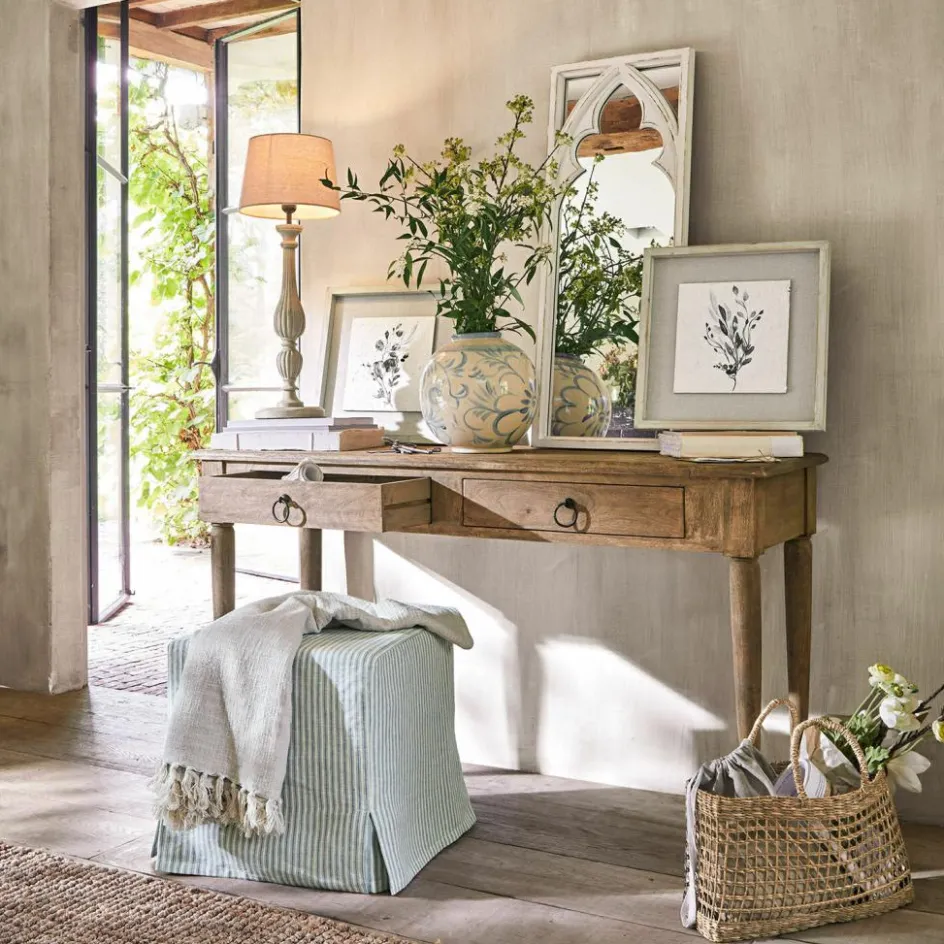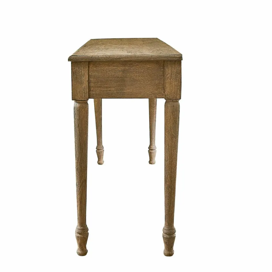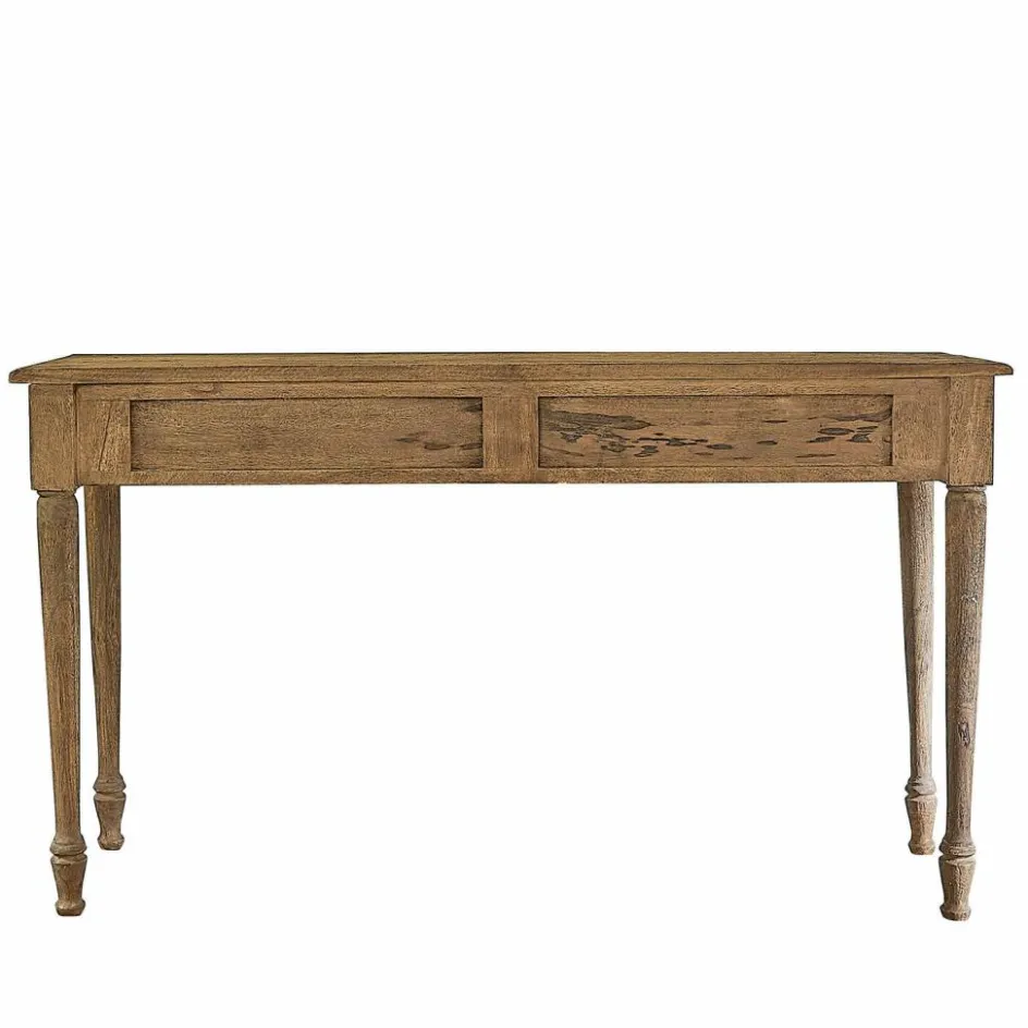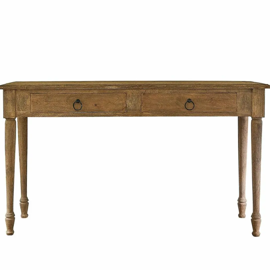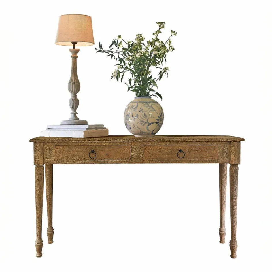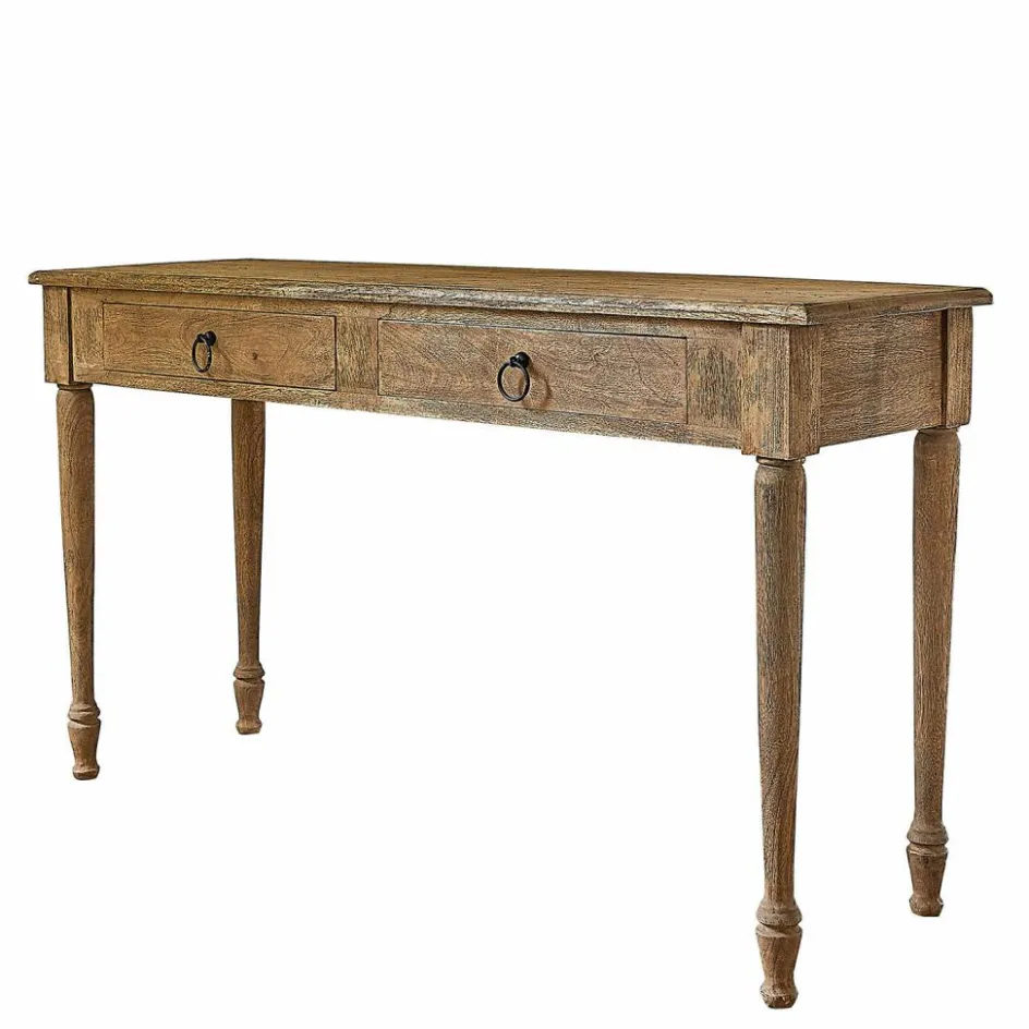 Entdecken Sie die perfekte Symbiose von Funktionalität und Design mit dieser charmanten Konsole. Das massive Holz, mit seiner natürlichen Maserung und warmen Tönen, bringt einen Hauch von Landhausstil in Ihre Wohnräume. Die schlichte Eleganz des Designs fügt sich harmonisch in jede Einrichtung ein, sei es im Eingangsbereich, im Wohnzimmer oder als stilvoller Schreibtisch im Home-Office. Die beiden Schubladen sind nicht nur dekorativ, sondern auch äußerst praktisch und bieten Platz für alles, was Sie gerne griffbereit haben möchten. Die feinen Rundungen an den Beinen und die leicht abgerundeten Ecken der Ablagefläche unterstreichen die liebevolle Verarbeitung und sorgen für einen weichen Übergang zwischen Möbelstück und Raum. Diese Konsole ist ein wahres Multitalent, das mit Leichtigkeit jedem Raum eine persönliche Note verleiht.