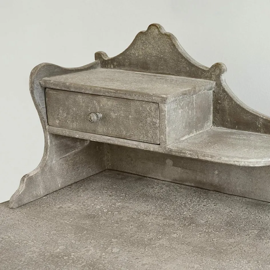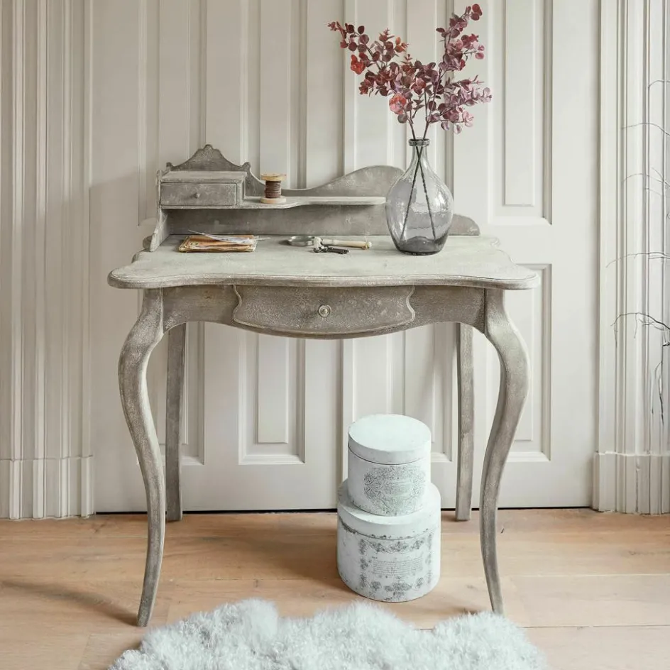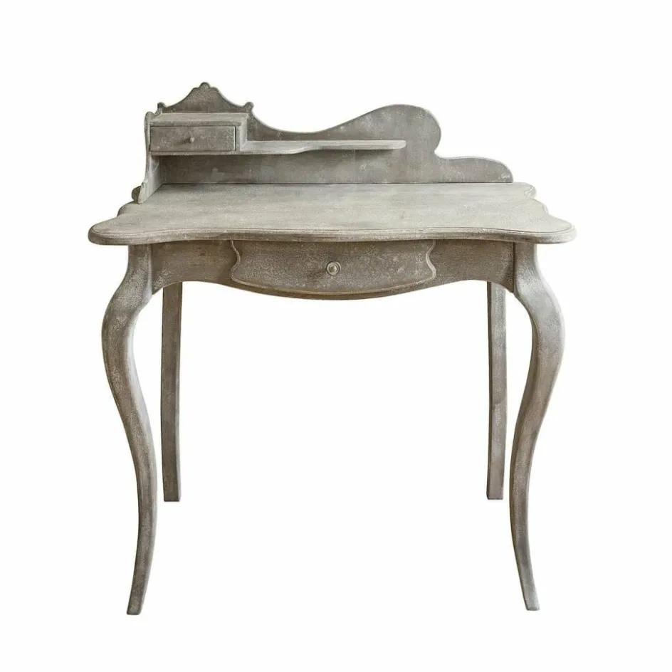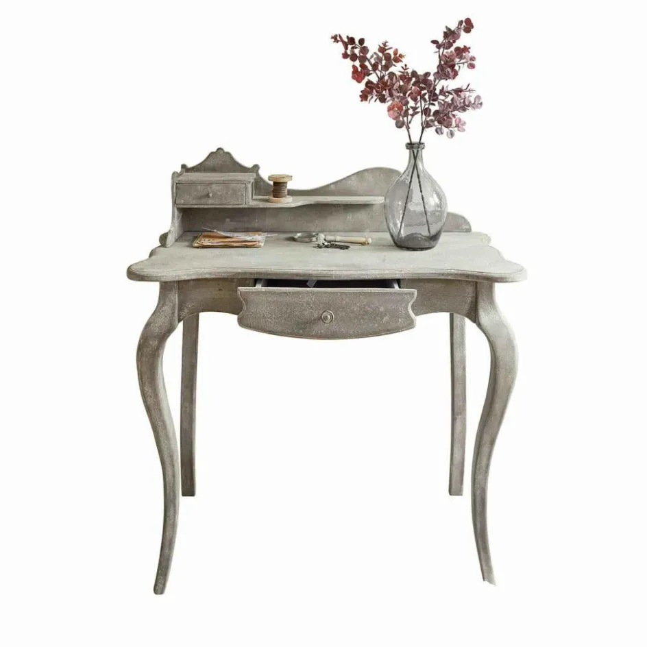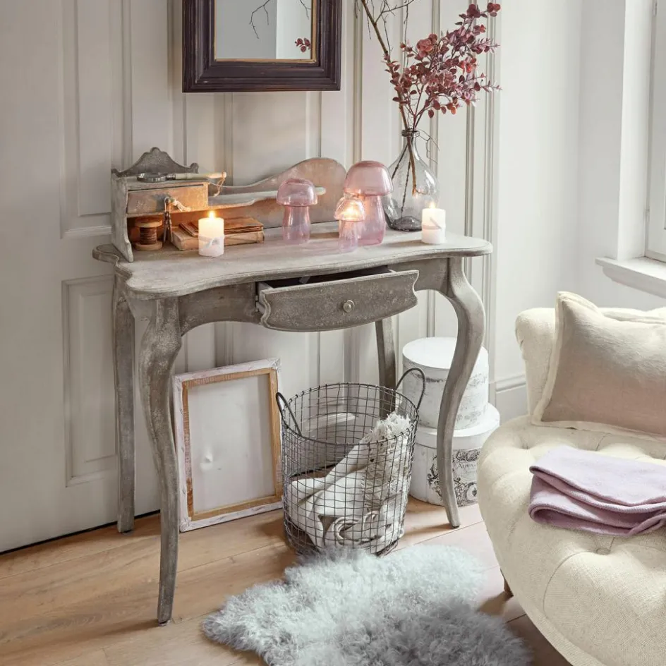 Mit dieser Konsole holen Sie sich ein Stück Nostalgie ins Haus. Die romantische Formgebung mit den geschwungenen Beinen und der dekorativen Rückwand erinnert an vergangene Zeiten und bringt eine warme, einladende Note in jeden Raum. Das sanfte Antikgrau-Finish verleiht dem Möbelstück eine charmante Patina, die wunderbar zu Shabby Chic und Landhaus-Stilen passt. Neben ihrer optischen Schönheit überzeugt die Konsole auch funktional: Zwei praktische Schubladen und eine zusätzliche Ablage bieten Platz für Schreibutensilien, Dekorationen oder kleine Alltagsgegenstände. Ob im Eingangsbereich, im Schlafzimmer oder als stilvoller Arbeitsplatz im Wohnbereich – dieses Möbelstück verbindet nostalgisches Design mit praktischer Raffinesse.