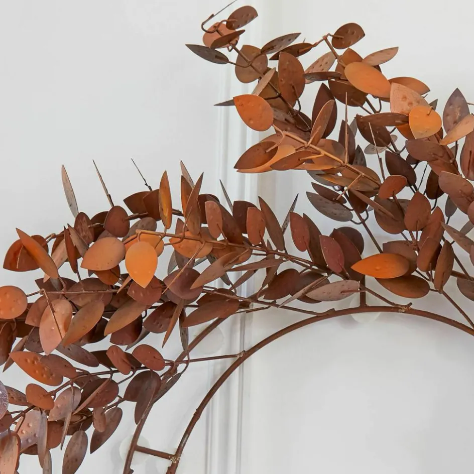 Ein Kranz, der mehr ist als eine einfache Dekoration – er ist ein Kunstwerk aus Metall, das mit filigranen Blättern eine besondere Leichtigkeit vermittelt. Die geschwungenen Formen und die fein strukturierte Oberfläche verleihen ihm eine außergewöhnliche Tiefe. Seine warmen Rost- und Kupfertöne erinnern an goldenes Herbstlaub und setzen einen natürlichen, stilvollen Akzent in jedem Zuhause. Ob an der Haustür als charmante Begrüßung, als stimmungsvolle Tischdeko oder als kunstvoller Blickfang an der Wand – dieser Kranz ist eine Hommage an zeitlose Schönheit und handwerkliche Raffinesse.