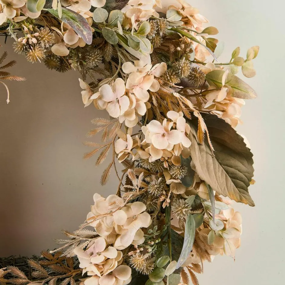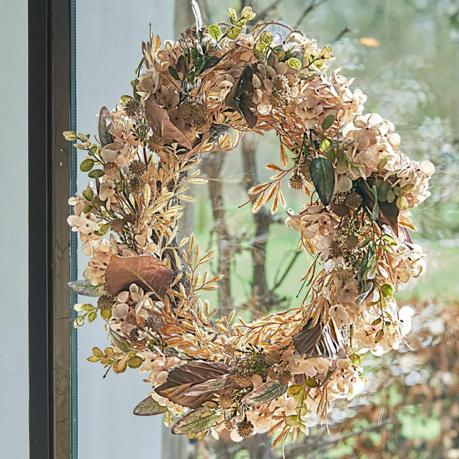 Die prächtigen Hortensienblüten haben ihr strahlendes Weiß bereits in zartes Rosé verwandelt, das Grün der Blätter im Garten wird langsam von Braun-Nuancen übertönt – das sind ohne Zweifel die ersten Vorboten des nahen Herbstes und doch meint man, die Wärme des Sommers noch auf diesem Kranz zu spüren. Eine warme, entspannte Ausstrahlung, die wir gerne auch im Haus genießen. Der Kranz wurde kunstvoll von Hand gebunden, doch nicht mit echten Blüten, Blättern und Ziergräsern, sondern mit naturgetreuen Nachbildungen, so dass Sie mit diesem Kranz auch ein sehr lange haltbares Deko-Objekt haben, das Ihnen viele Jahre den Herbst verschönern kann. Der Kranz macht sich wunderschön auf einer Kommode oder dem Esstisch, Sie können ihn mit einem Schmuckband aber auch als Wand- oder Türkranz dekorieren. Passend zum Kranz gibt’s auch einen Deko-Blumenstrauß (23678).