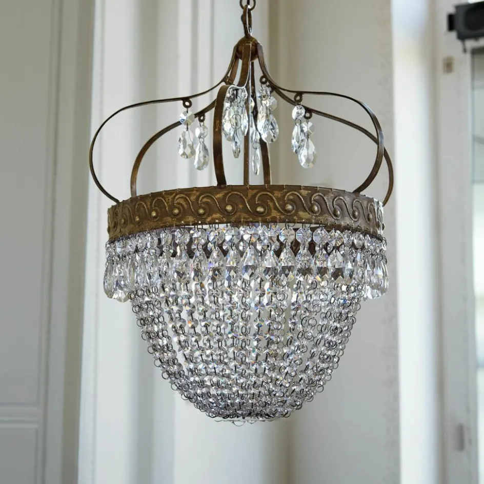Wir präsentieren einen atemberaubenden Kronleuchter, der Ihre Vier Wände in eine Luxus-Wohnung verwandeln wird. Sein robustes Eisengestell, verziert mit einer anmutigen Antik-Patina, bildet den perfekten Kontrast zu den funkelnden Glasprismen, die das Licht in unzählige, faszinierende Muster brechen. Dieses Meisterwerk ist mehr als nur eine Lichtquelle – es ist ein Kunstwerk, das Ihre Wohnräume in einem zauberhaften Glanz erstrahlen lässt. Ob über dem Esstisch, in der Diele oder im Wohnzimmer – dieser Kronleuchter verleiht jedem Raum eine unvergleichliche Atmosphäre und zieht alle Blicke auf sich. Lassen Sie sich von der Magie dieses Kronleuchters verzaubern und genießen Sie die perfekte Symbiose aus traditioneller Handwerkskunst und zeitlosem Design.