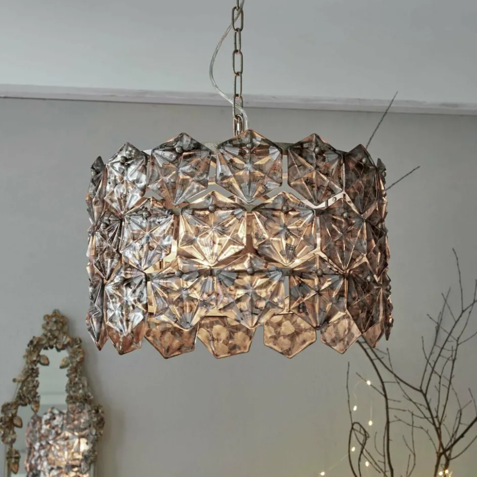 Wie ein funkelnder Nachthimmel schwebt diese außergewöhnliche Hängelampe im Raum: Sternförmige Prismen aus Glas, kunstvoll facettiert und mit einem antik anmutenden Bauernsilber-Finish veredelt, bilden den äußeren Kranz dieses einzigartigen Leuchters. Von innen heraus erleuchten fünf Leuchtmittel (exklusive) das Spiel aus Form, Licht und Schatten – und lassen die Glassterne beeindruckend funkeln. Die Kombination aus strukturierter Oberfläche und metallisch-kühler Eleganz macht den Leuchter zum glanzvollen Mittelpunkt über dem Esstisch, in der Diele oder als Statement im Wohnbereich.