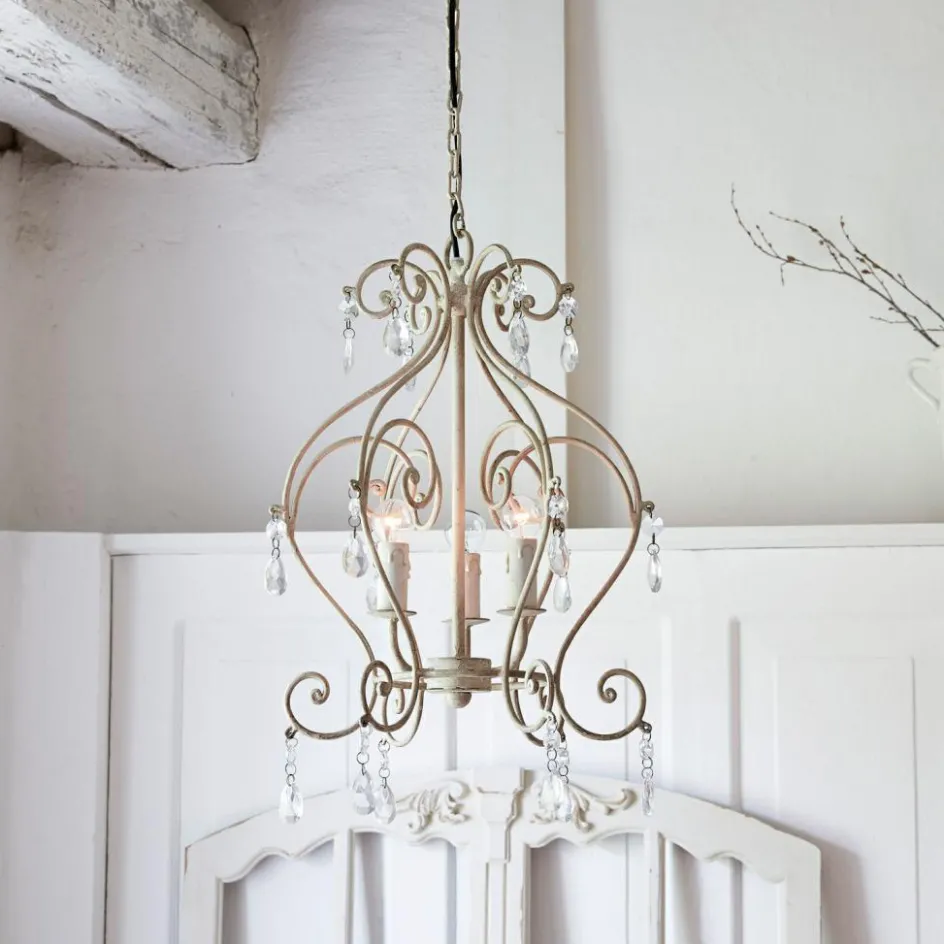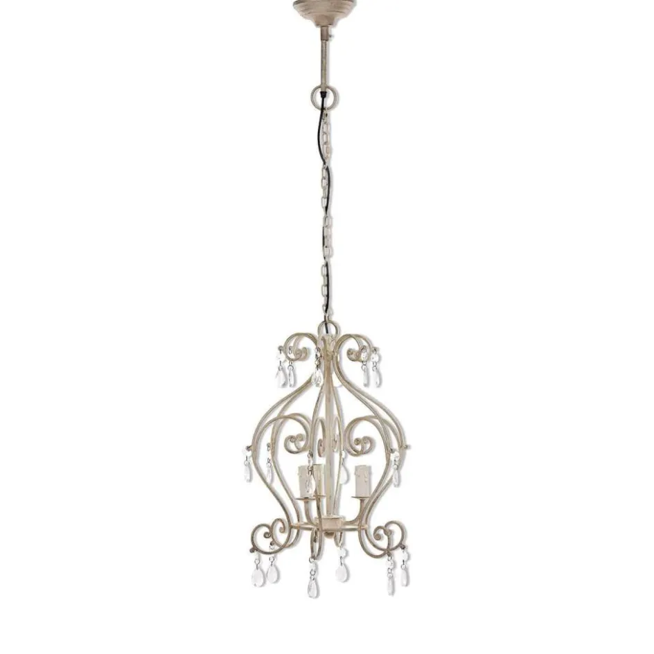 Ein wertvolles Highlight mit beinahe royalem Flair. Der wunderschöne, luxuriöse Leuchter bezaubert mit seinem romantisch geschwungenen Gestell aus Eisen. Dieses zieren funkelnde Glas-Prismen – ein reizendes Extra. Das kunstvolle Design wird mit drei Glühbirnen erleuchtet, sodass Sie eine ausgesucht schöne Lichtstimmung erleben. An den Lampenfassungen befinden sich kleine Tropfenförmchen, die herabfließendes Wachs hübsch nachahmen. Als komme dieser Leuchter aus geraumer Vorzeit und wurde damals, wie üblich, mit Kerzen betrieben. Ein hübsches kleines Detail. Zudem ist das elegante Kunstwerk eine wahre optische Zierde, ob an- oder ausgeschaltet. Es passt hervorragend zum Shabby-Chic und lässt das Herz aller Romantiker höher schlagen. Eine gekonnte Wahl für Wohn- oder Schlafzimmer, an der Sie lange Freude haben werden. Luxus pur mit zartem Charme – ein absolutes Lieblingsstück.