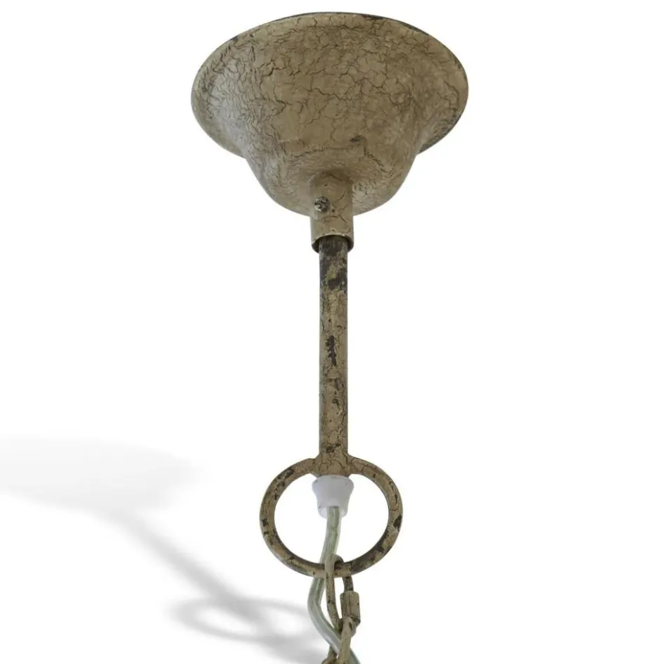 Luxus und Glamour pur kommen mit diesem prachtvollen Leuchter in Ihr Zuhause. Ein Statement-Stück, das alle Blicke auf sich lenkt. Zahlreiche kunstvoll geschliffene Glasprismen funkeln in seinem Licht. Das formschöne Gestell besteht aus Eisen, wobei der umlaufende Ring von kleinen, eingerpägten Blütenornamenten geziert wird. Er wird an einer passeneden Eisenkette und einem ebenfalls antik verdelten Baldachin an der Decke befestigt. Alles wurde von Hand veredelt. Der beinahe schon royale Charakter passt wunderbar zum Shabby-Chic. Der zeitlos edle Chic wird Sie viele Jahre lang erfreuen. Geschmackvoller kann man seine Räume kaum illuminieren.