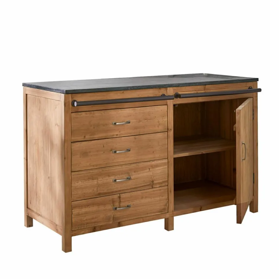 Dieser großzügige Küchenschrank ist die ideale Lösung für zusätzlichen Stauraum in Ihrer Küche. Mit seinen vier Schubladen und dem Stauraum hinter einer großen Tür bietet er Platz für alles, was Sie schnell zur Hand haben möchten, sei es Geschirr, Besteck oder Kochutensilien. Die massive Arbeitsplatte aus Blaustein ist besonders langlebig und pflegeleicht, perfekt für alle Arbeiten in der Küche. Das rustikale Tannenholz, aus dem der Schrank gefertigt ist, bringt Wärme und Natürlichkeit in Ihr Zuhause und unterstreicht den umweltfreundlichen Ansatz dieses Möbels. Eine zusätzliche Eisenstange kann zur Ablage von Handtüchern, Spültüchern oder anderen Dingen genutzt werden. Ein praktisches und zugleich ansprechendes Stück, das Ihre Küche komplettiert. Alternativ ist dieser Küchenschrank auch eine beeindruckende Kommode im Esszimmer.