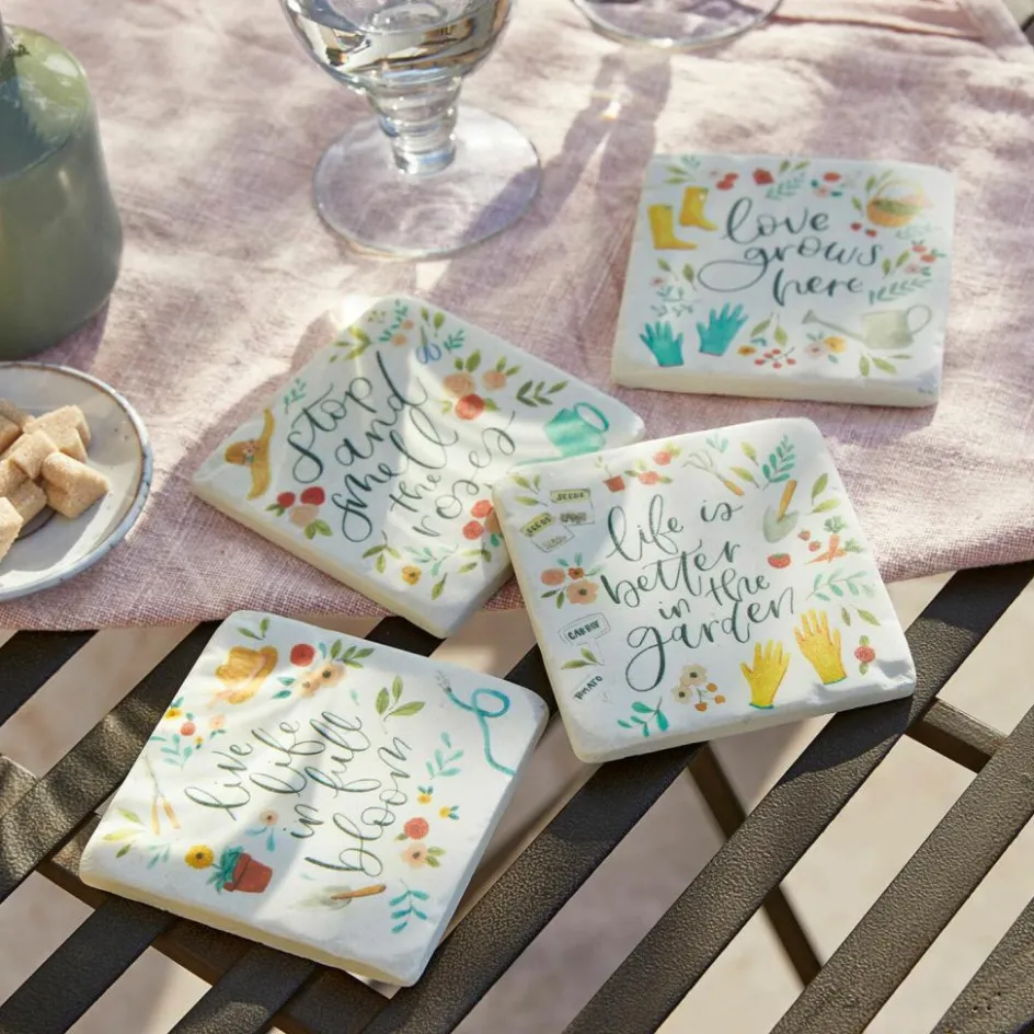 Diese Sammlung von vier kunstvoll gestalteten Untersetzern bringt das Flair eines blühenden Gartens auf Ihre Tafel. Jeder Untersetzer ist ein kleines Kunstwerk, das nicht nur Ihre Tische schont, sondern auch eine Geschichte erzählt. Mit Sprüchen, die zum Lächeln anregen, und Designs, die die Seele des Sommers einfangen, sind diese Untersetzer nicht nur praktisch, sondern auch ein Gesprächsanlass. Ob für den morgendlichen Kaffee im Freien oder die Abendcocktails unter Sternen, diese Untersetzersetzer sind ebenso robust wie charmant und können das ganze Jahr über verwendet werden.