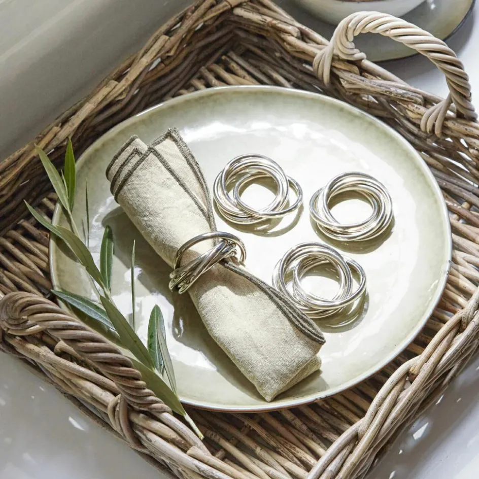 Wenn kleine Anlässe und große Feste anstehen, bereitet die Tischdekoration besonders viel Freude. Da dürfen auch die passenden Serviettenringe nicht fehlen. Nicht nur, dass sie ein unentbehrlicher Bestandteil der eleganten Tischkultur sind, sondern auch jeder Tafel das gewisse Etwas verleihen. Die Anmutung ist klassisch schlicht, die Gestaltungsidee reizvoll: Fünf silbrig schimmernde Ringe aus hochwertigem Messing werden effektvoll zu einer Einheit verbunden. So viel Raffinesse zieht alle Blicke auf sich. Und Ihre edlen Stoffservietten lassen sich damit auf besonders stilvolle Weise in Szene setzen. Im 4er Set werden die schmucken Accessoires bestimmt dauerhaft zum Einsatz kommen, denn sie passen sich jedem Tischambiente mühelos an – von rustikal über modern bis elegant.