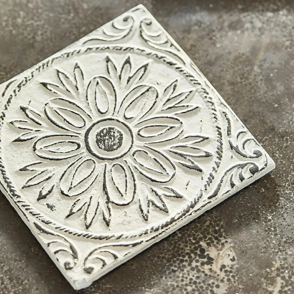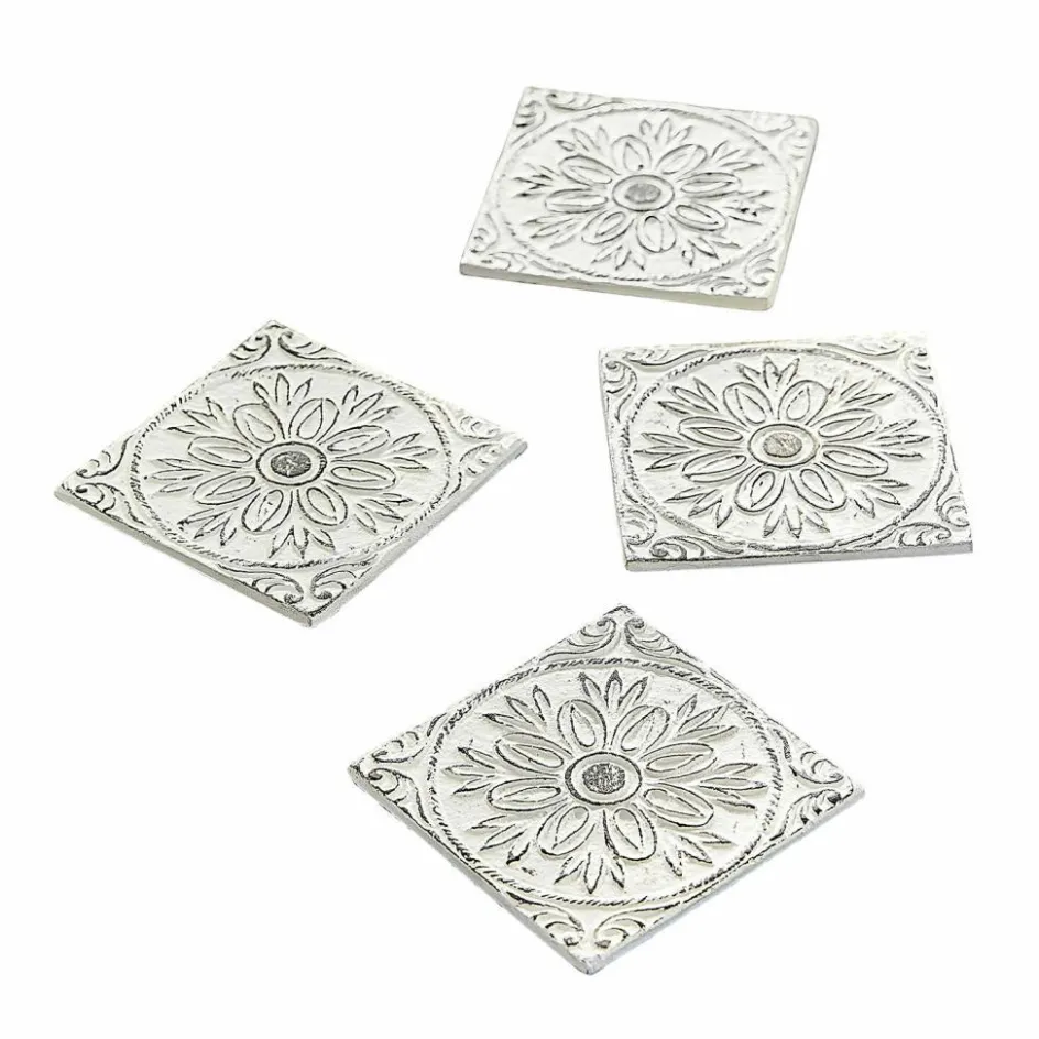Klassische Schönheit trifft auf praktische Funktionalität – dieses Untersetzer-Set im 4er-Pack begeistert mit einem kunstvollen floralen Design, das an antike Fliesen erinnert. Die filigranen Blütenmuster, kunstvoll in das Material eingearbeitet und mit einem White-Washed-Finish veredelt, verleihen jedem Tisch eine stimmungsvolle Note. Die Untersetzer sind nicht nur ein stilvolles Accessoire, sondern auch ein zuverlässiger Schutz vor Kratzern und Flecken auf empfindlichen Oberflächen. Ob als Dekorationselement für den Couchtisch oder als nützlicher Helfer bei Festlichkeiten – diese Untersetzer sind vielseitig einsetzbar und werten jedes Ambiente auf.