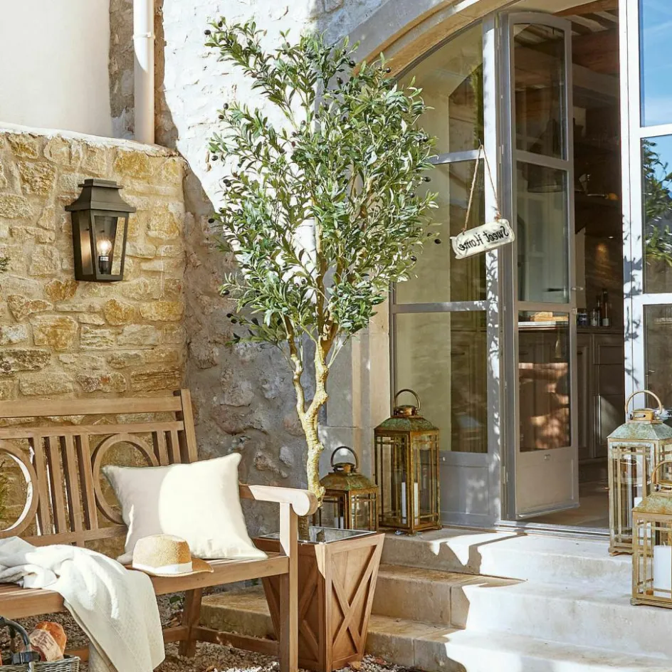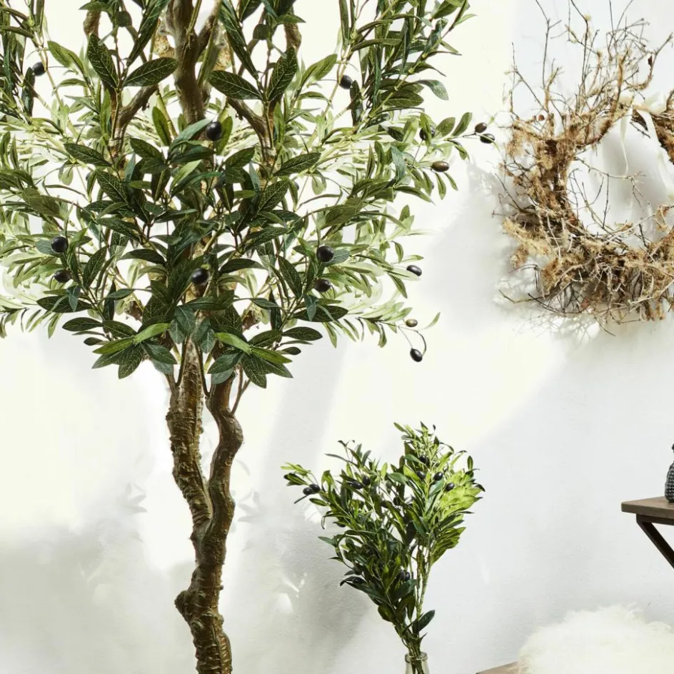 Wer schon einmal eine Siesta unter einem uralten, knorrigen Olivenbaum genießen durfte, wird diese einzigartigen Momente nicht vergessen. Und bald können auch Sie solche wunderbaren Stunden erleben, sogar ohne die Koffer zu packen, sondern einfach in Ihrem Wohnraum sitzend – mit Blick auf den prachtvollen Olivenbaum, der dort steht. Jede Unregelmäßigkeit des urigen Stamms erzählt von einem langen Leben, der absolute Blickmagnet aber ist die imposante Krone aus den typisch silbrig-grünen Blättern. Kein Wunder, dass Olivenbäume als die Könige des Mittelmeerraumes gelten und für alle nördlich der Alpen der Inbegriff mediterranen Lebensgefühls sind. Zu dieser Faszination trägt sicherlich auch bei, dass ein Olivenbaum nicht nur ein Augenschmaus ist, sondern uns auch mit leckeren Früchten und wunderbarem Öl beschenkt. Deshalb versucht auch dieser Olivenbaum mit allen Mitteln, seinen Verwandten rund ums Mittelmeer nachzueifern. So trägt er ebenfalls ein ganzjährig grünes Laubkleid, auch wenn draußen kaltes Winterwetter herrscht, und zwischen dem Laub leuchten sogar hier und da dunkle, wie echt aussehende Oliven. Essen sollten Sie aber lieber die pikant eingelegten Sorten von Ihrem Lieblingsitaliener. Dieses von Hand gefertigte florale Kunstwerk hat bereits einen stabilen Zementtopf, Sie können den Olivenbaum aber auch sehr schön in einen klassischen Übertopf aus Terrakotta oder in einem modernen aus Stein oder Keramik stellen.