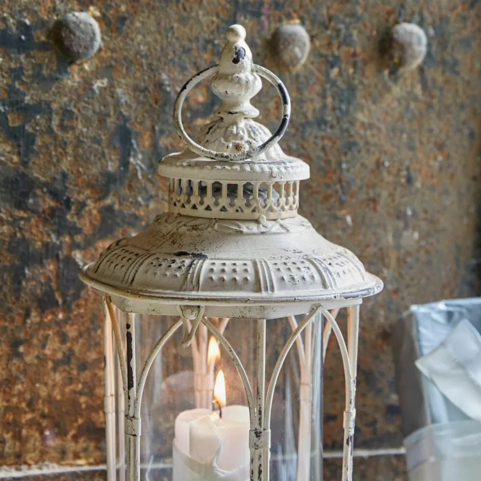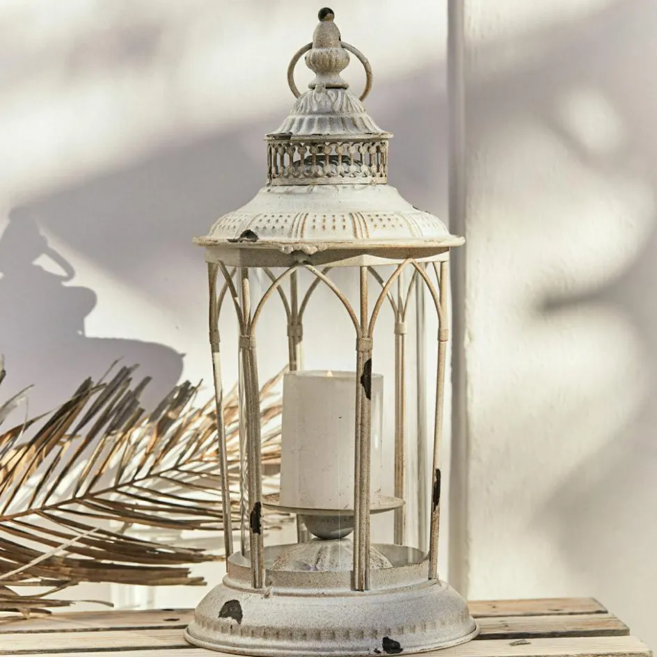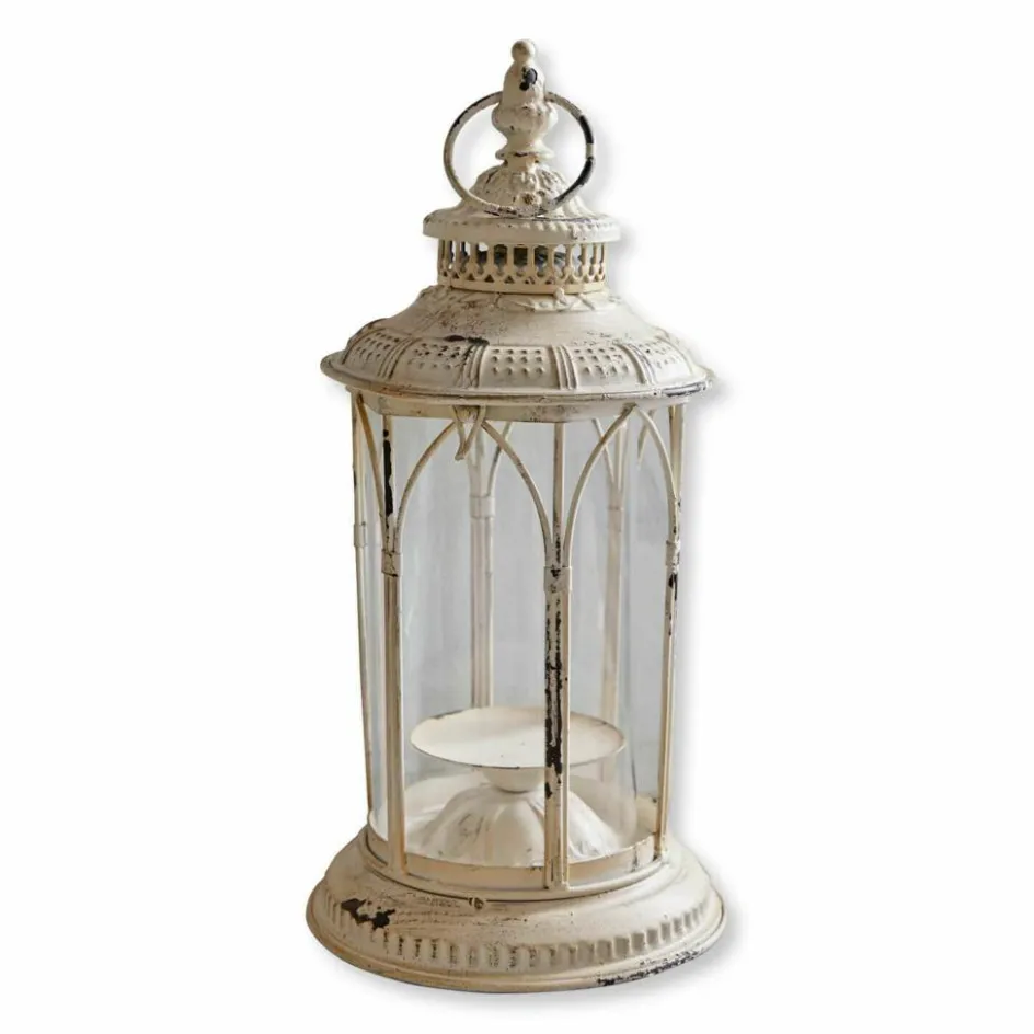 Vintage-Charme pur – diese kunstvolle Laterne ist ein echtes Lieblingsstück für alle, die den Shabby-Look lieben. Sie besteht aus Eisen mit sehr aufwendig aufgebrachtem Antik-Finish und einem Glas-Einsatz, das die Flamme vor Wind schützt. Das stilsichere Design ist sehr dekorativ und charmant. Es adelt wirklich jeden Raum mit einem Hauch Vintage-Flair, vielleicht am Fenster oder auf dem Boden platziert. Entzünden Sie darin ein Teelicht oder eine Stumpenkerze und erleben Sie eine geborgene, heimelige Atmosphäre, die das ganze Jahr über ein Genuss ist. An dem Ring oben lässt die formschöne Laterne sich sehr einfach verstellen oder auch aufhängen. Schmücken Sie den Tisch, eine Anrichte oder auch den Fußboden damit und entscheiden Sie nur noch, welcher Raum sich auf dieses nostalgische Accessoire freuen darf – der Flur, das Schlafzimmer oder doch die Wohnräume?
