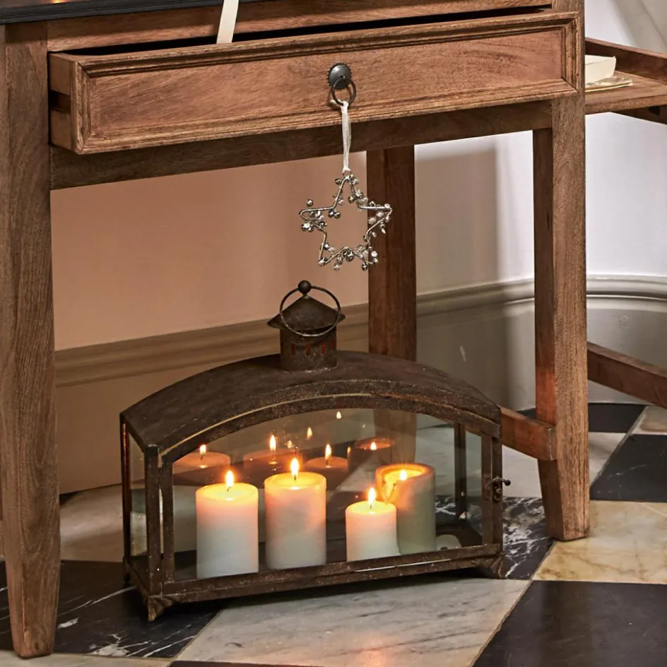 Wie ein antikes Stück wirkt diese schöne Laterne aus Eisen und Glas. Dazu trägt auch das stilechte Finish bei, das auf attraktive Weise an Rost-Effekte erinnert. Die im oberen Teil harmonisch geschwungene Form mit einem Tragegriff wirkt sehr harmonisch. Ob in Innenräumen oder auf dem Balkon, der Terrasse oder im Garten: Stellen Sie eine oder mehrere Kerzen oder Teelichter hinein und erfreuen Sie sich an heimeligen und stilvollen Lichtspielen. Hinter Glas ist die Flamme vor Wind geschützt, was den Outdoor-Gebrauch erleichtert. Mit einem Verschluss lässt die vordere Glasfront sich öffnen und schließen. An warmen Sommerabenden bei einem kühlen Gläschen Wein im Garten ein wunderbar stimmungsvolles Accessoire, das einen Hauch Romantik in jedes Ambiente zaubert. In jeder Jahreszeit ideal nutzbar, denn warmer Kerzenschein hat immer Saison. Ein Stück mit antikem Charakter, das sich in jedes Ambiente perfekt einfügt