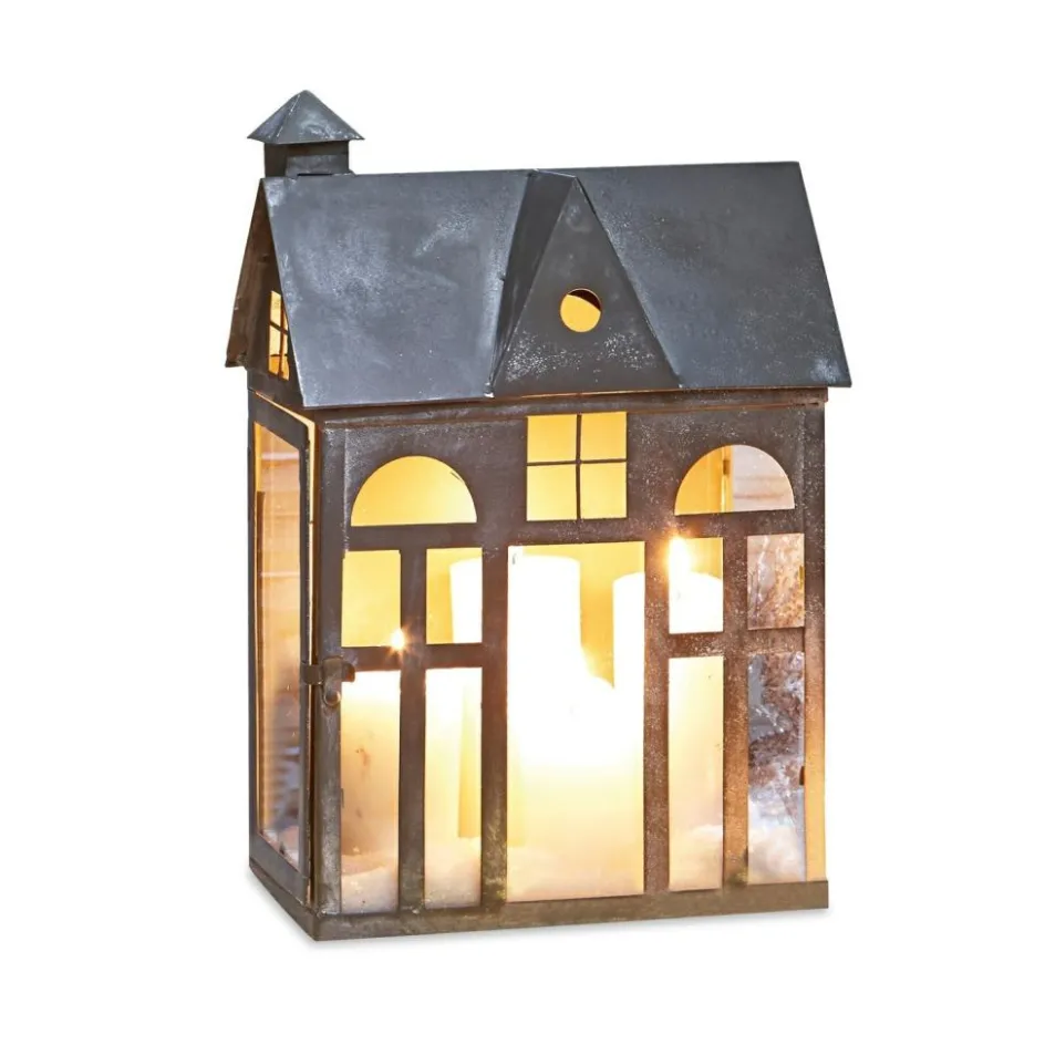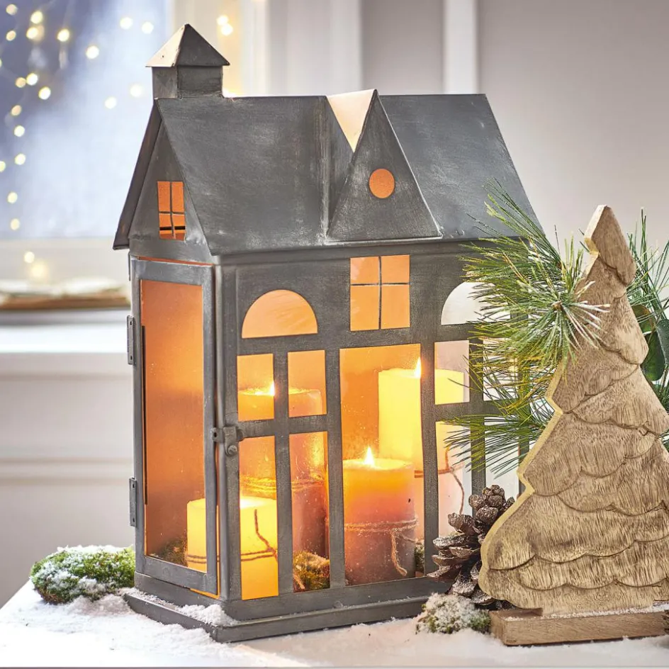 Genial einfach oder: Einfach genial! Schon eine einzelne Stumpenkerze lässt die eiserne Laterne in Form eines Hauses von innen heraus erstrahlen. Das einladende Licht, dass durch die Glaseinsätze der bodentiefen Fenster fällt, verbreitet im Handumdrehen Gemütlichkeit pur. Wer mag, darf gerne auch ein wenig tiefer in die Deko-Ideen-Kiste greifen und das Häuschen über die seitliche Öffnung etwas üppiger füllen. Ob Tannengrün, eine batteriebetriebene Lichterkette und ein paar kleine Tierfiguren, Tannenzapfen oder glitzernde Weihnachtskugeln: Fertig ist das Highlight Ihrer Festtagsdekoration – absolut individuell und einzigartig.
