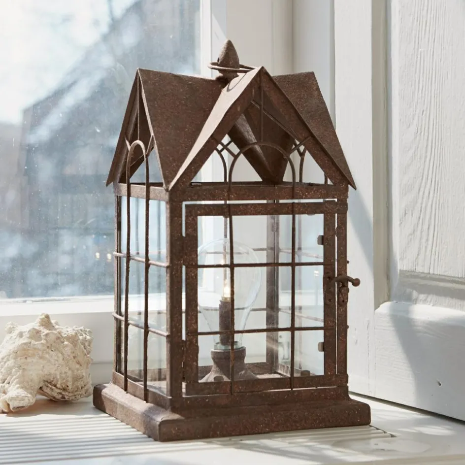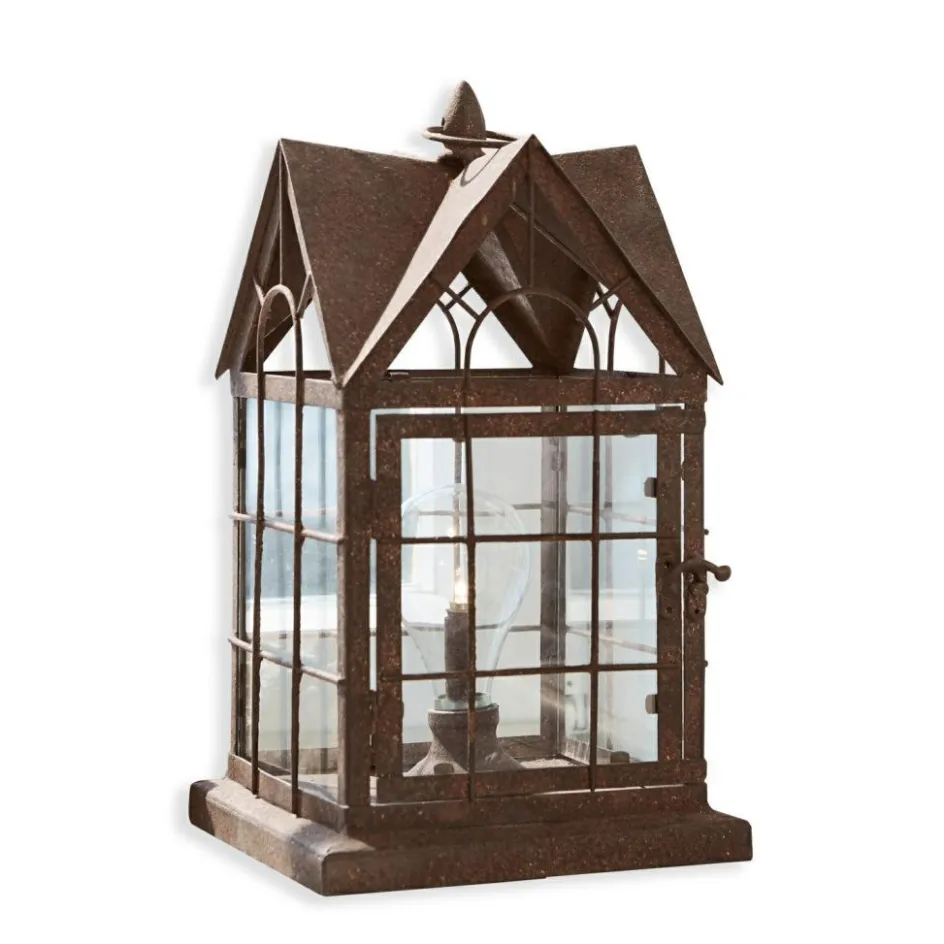 Für lauschige Momente in gemütlichen Ambiente sorgt dieses hübsche Accessoire. Die Form eines Hauses bringt heimeliges Flair. Man könnte sich gut vorstellen, dass in dem Häuschen kleine Bewohner ein- und auskehren. Das Antik-Finish unterstreicht den verträumten Vintage-Charme. Das Licht der wunderschönen Laterne aus Eisen wird durch eine Batterie betrieben. So können Sie jederzeit das Licht einschalten und auch über Nacht als Nachtleuchte anlassen. Ein weiterer Vorteil des Batteriebetriebs: Unschönes Kabelgewirr bleibt aus und auch die Notwendigkeit einer Steckdose ist nicht gegeben. So können Sie das verträumt wirkende Objekt dort platzieren, wo Sie möchten. Auch kleinere Kinder können sich in der Nähe des zauberhaften Laternen-Häuschens aufhalten, denn Gefahr durch Zündeln besteht nicht. Design und Funktionalität überzeugen gleichermaßen.