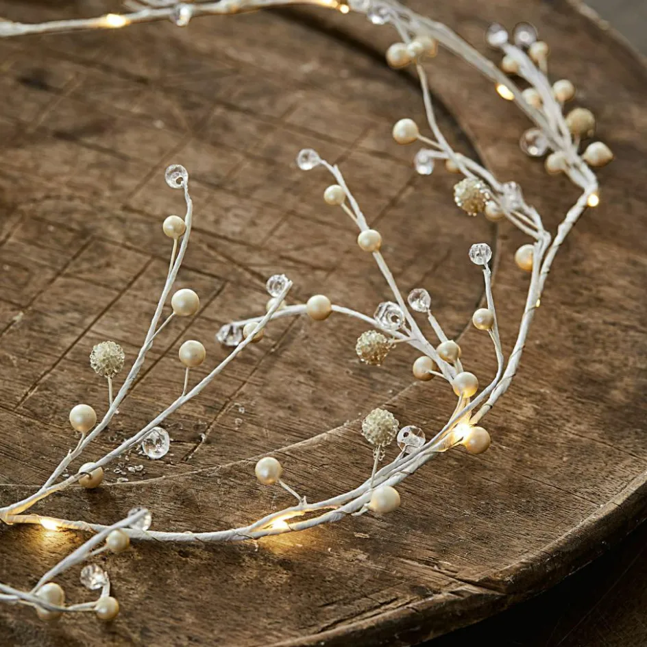 Wenn Sie an einem kalten Winterabend nach Hause zurückkehren und dort von warmem Licht und liebevoll arrangierten Deko-Objekten empfangen werden möchten, darf auch eine Lichterkette wie diese nicht fehlen. Perlmuttfarbige Perlen, die einem kostbaren Geschmeide entnommen sein könnten, strahlen im Wechselspiel mit klaren und gefrosteten Perlen, die Romantikerinnen an gefrorene Tautropfen erinnern, die im Sonnenlicht glitzern und funkeln. Eine Lichterkette, die nicht nur wunderschön aussieht, sondern sich auch fantastisch vielseitig dekorieren lässt. An einem besonderen Zweig, in einer Schale, zwischen anderen Deko-Objekten – Ihrer Kreativität sind da keine Grenzen gesetzt. Vor allem auch, weil diese Lichterkette batteriebetrieben wird, also keinen Stromanschluss braucht. Mit dieser Lichterkette entscheiden Sie sich auch für ein Deko-Objekt, das sorgfältig von Hand gefertigt wurde und Sie deshalb viele Jahre nicht nur durch die Weihnachtszeit begleiten wird. Für die Kette brauchen Sie drei Batterien vom Typ AA, die nicht im Lieferumfang enthalten sind.