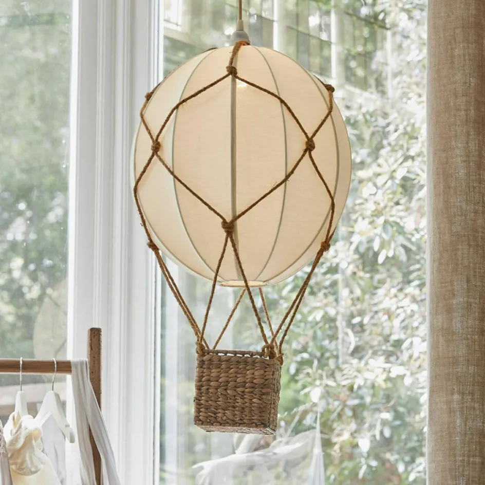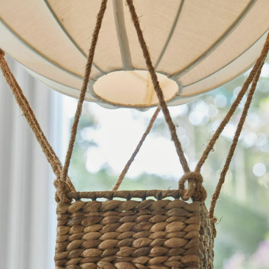 Tauchen Sie das Kinderzimmer in eine magische Welt mit dieser einzigartigen Hängelampe in Form eines Heißluftballons. Der Lampenschirm aus weicher Baumwolle verteilt das Licht sanft und schafft eine beruhigende Atmosphäre, ideal für ruhige Stunden und süße Träume. Besonders detailverliebt zeigt sich der kleine Ballon-Korb, der mit Jute umwickelt ist und an ein echtes Abenteuer erinnert. Diese Lampe kombiniert Funktionalität mit einem verspielten Design und ist der perfekte Hingucker für das Zimmer Ihres kleinen Schatzes.