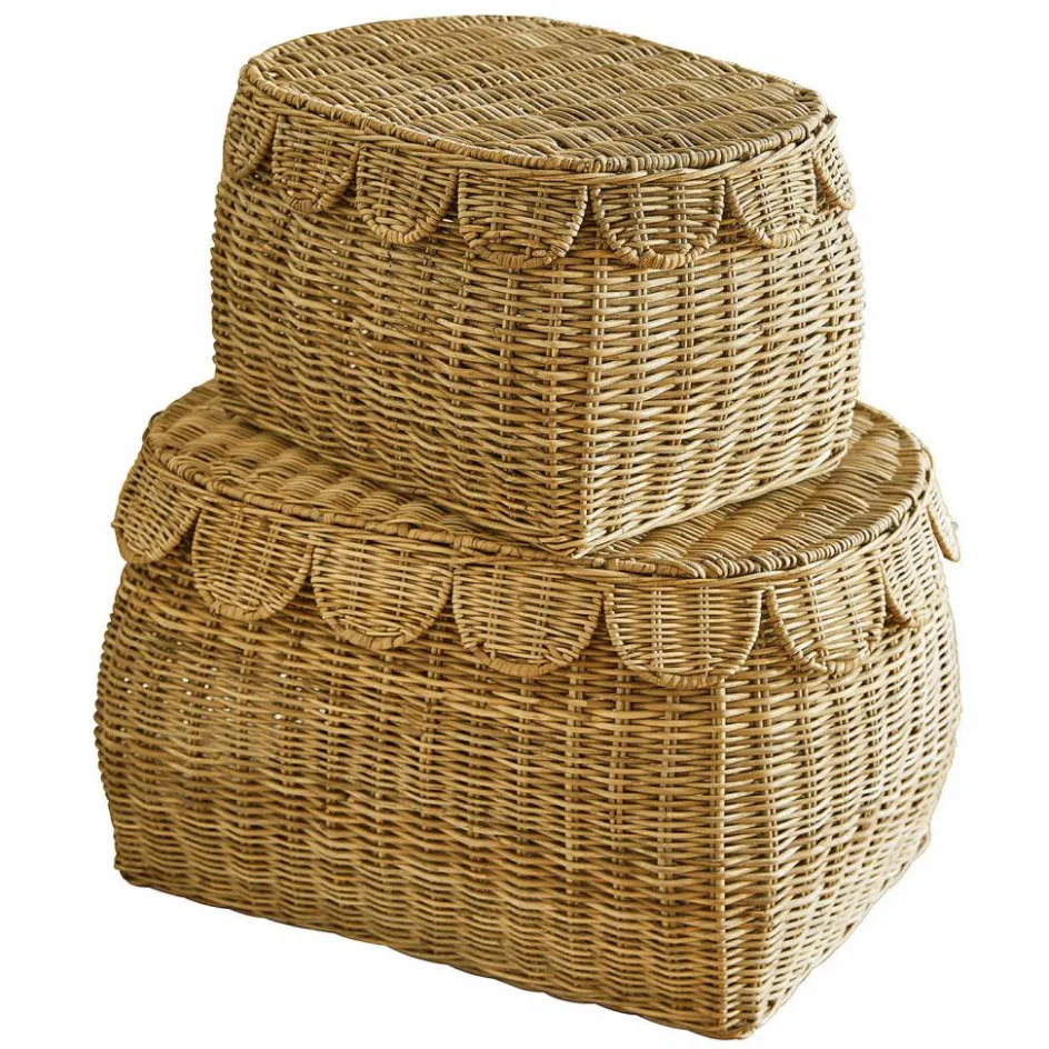 Ein Aufbewahrungsset, das Funktionalität mit Charme verbindet! Die beiden Körbe aus hochwertigem Rattan bezaubern durch ihre sanfte Farbgebung und den verspielten Rand, der an liebevoll gestaltete Kinderzimmer erinnert. Ob für Spielsachen, Kuscheltiere oder andere Schätze – die Körbe bieten ausreichend Platz und schließen mit einem praktischen Deckel, der zugleich Ordnung schafft und neugierige Blicke verhindert. Die natürliche Struktur des Rattans verleiht jedem Raum Wärme und Lebendigkeit, während die sanften Wellen im Design eine kindliche Leichtigkeit ausstrahlen. Dieses Set bringt eine harmonische Atmosphäre und viel Stauraum in jeden Raum.