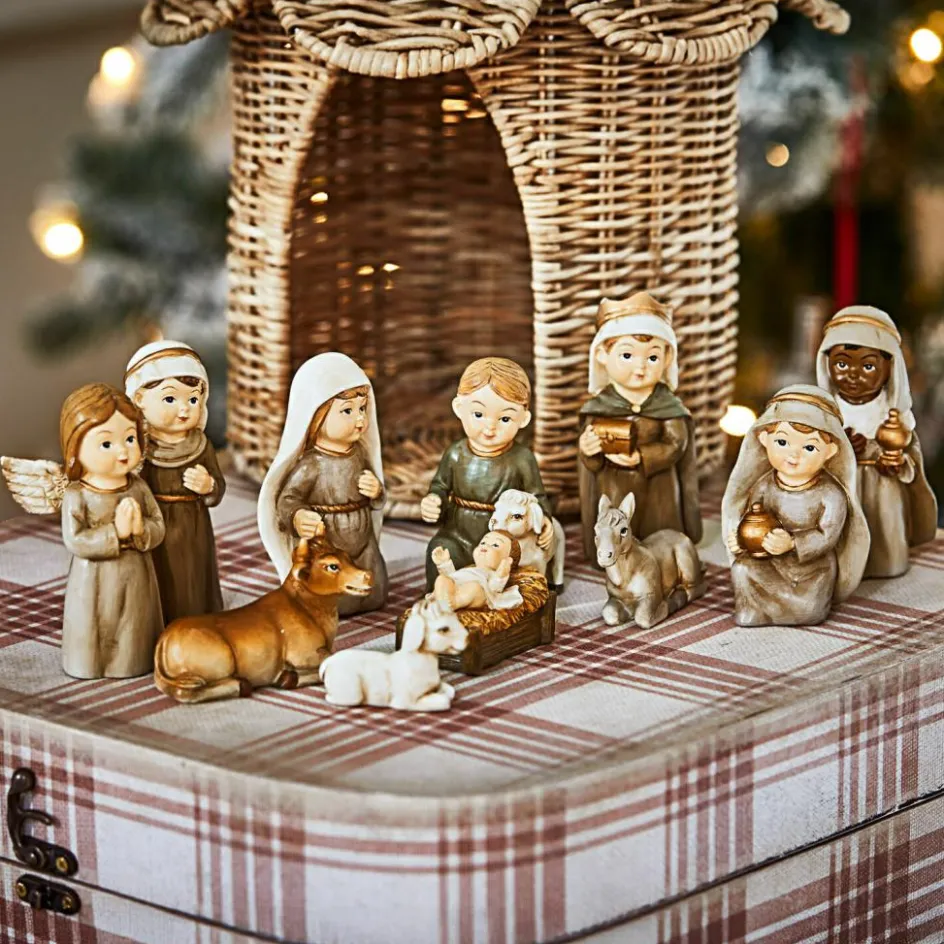 Einmal Weihnachten aus Kinderaugen sehen – mit diesem niedlichen Krippen-Set wird genau das möglich. Die acht handbemalten Figuren aus Polyresin erzählen die Weihnachtsgeschichte in einer kindgerechten, sanften Formsprache. Jede einzelne Figur – vom schlafenden Jesuskind bis hin zu den drei Tieren – wirkt wie ein kleiner Charakter aus einem Wintermärchen. Mit ihrer kompakten Größe liegen sie gut in kleinen Händen und laden zum liebevollen Arrangieren und Erzählen ein. Die sanft-matten Farben, das freundliche Gesichtsausdruck jedes Charakters und die liebevollen Details machen diese Krippe zum Herzstück im Kinderzimmer oder auf dem Beistelltisch. Eine charmante Art, Kindern spielerisch weihnachtliches Brauchtum näherzubringen – und dabei echte Gemütlichkeit zu verbreiten.