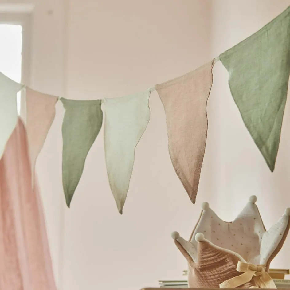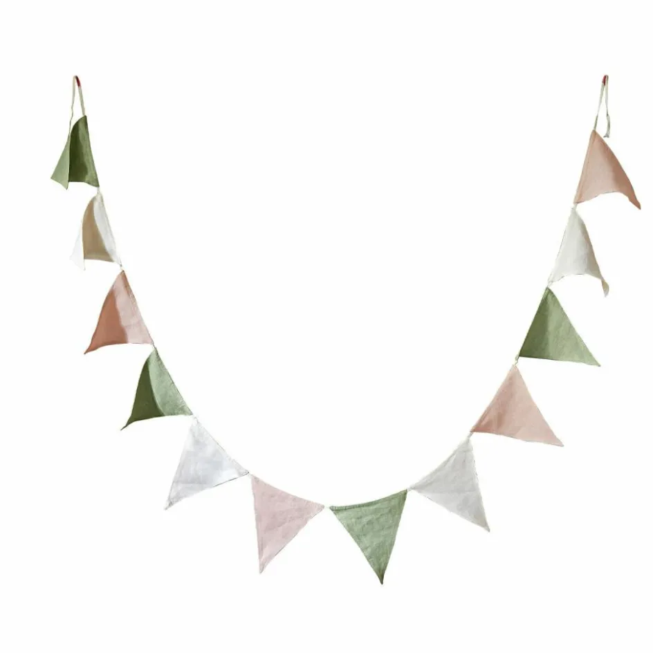 Verwandeln Sie das Kinderzimmer oder Ihre Festlichkeiten in eine bezaubernde Oase mit dieser wunderschönen Girlande. Die zarten Wimpel in den Farben Desert Sage, Rose Smoke und Lily White, gefertigt aus hochwertigem Leinen, schwingen sanft an einer robusten Baumwollschnur. Diese Girlande vereint natürliche Farbtöne und robuste Qualität und ist nicht nur ein langlebiger, sondern auch ein waschbarer Blickfang. Ob für Geburtstage, Feiertage oder als dauerhafte Dekoration, etwa im Kinderzimmer – diese Girlande bringt Freude und Harmonie in jeden Raum.