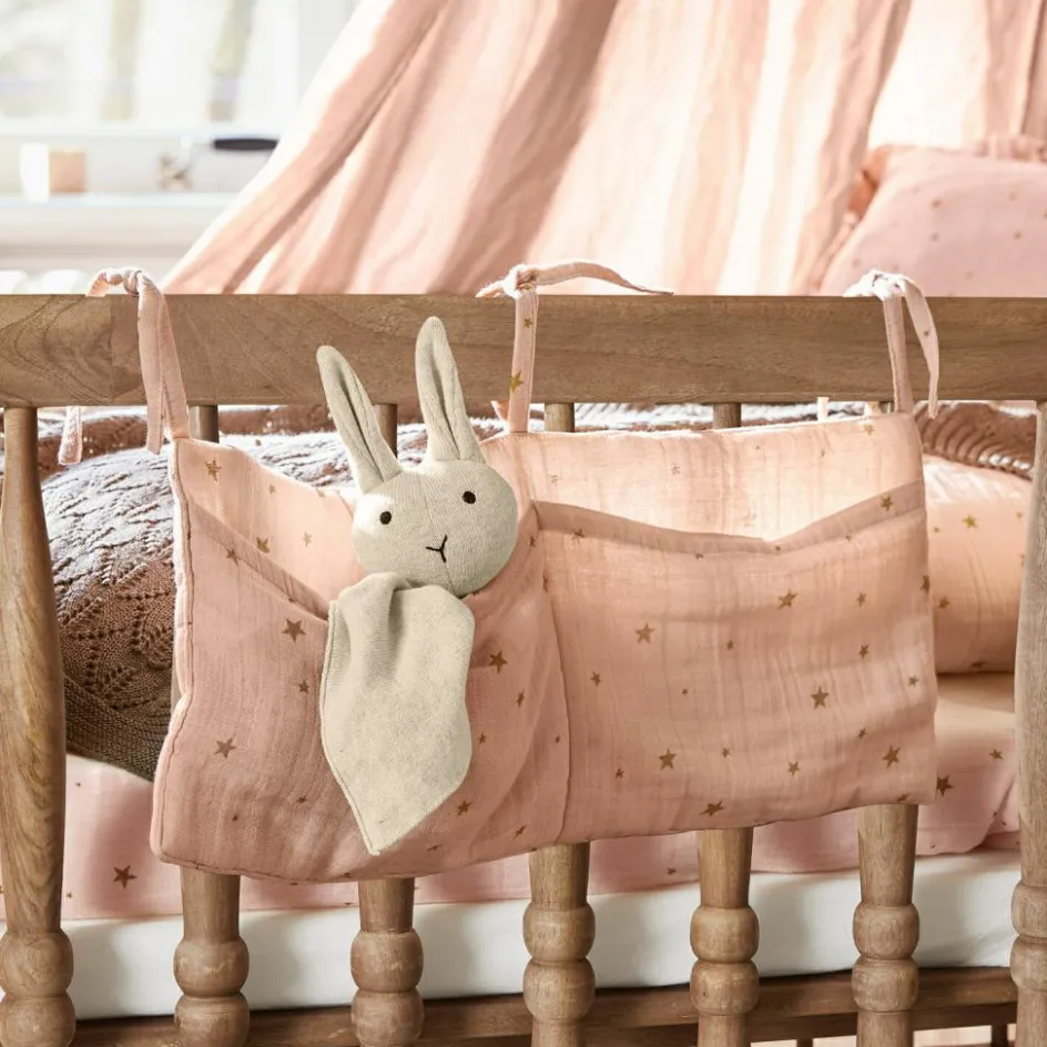 Diese charmante Aufbewahrungstasche aus hochwertigem Musselin ist nicht nur praktisch, sondern auch ein echter Hingucker im Kinderzimmer. Das zauberhafte Sternenmuster auf dem weichen, aber strapazierfähigen Stoff verleiht der Tasche eine besondere Note. Mit ihren Bändern lässt sie sich leicht aufhängen, wodurch sie ideal zur Aufbewahrung von Spielzeug, Pflegeprodukten oder kleinen Kleidungsstücken geeignet ist. Ob am Kinderwagen oder im Kinderzimmer am Babybett, diese Tasche ist ein stilvolles und funktionales Accessoire für den Alltag.
