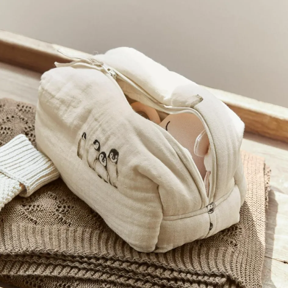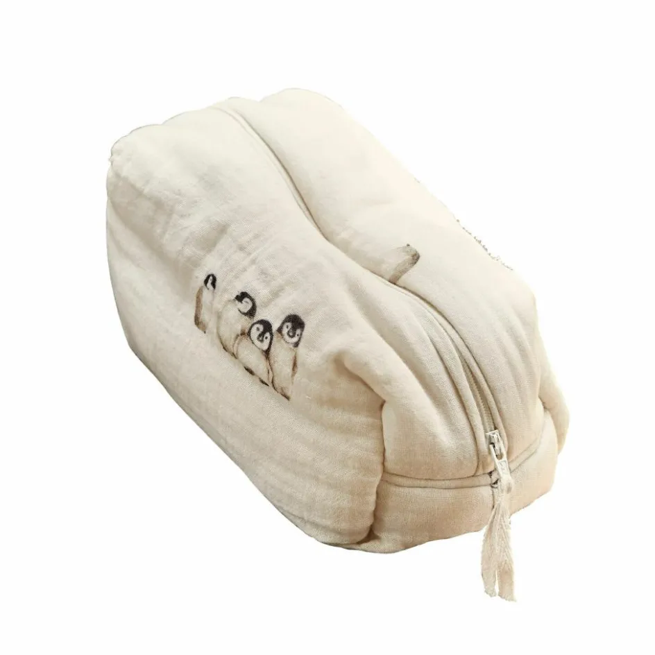 Diese zauberhafte Kosmetiktasche aus weichem, wattiertem und atmungsaktivem Musselin-Stoff begeistert mit ihrem liebevollen Pinguinmuster. Die sanfte Haptik und die neutrale Farbgebung machen sie zum perfekten Begleiter für unterwegs. Ob für Eltern oder Kinder, die Tasche bietet genügend Platz für alle wichtigen Dinge, die stets griffbereit sein müssen. Der hochwertige Reißverschluss garantiert sicheres Verschließen, während die liebevolle Verarbeitung für langlebigen Gebrauch sorgt.