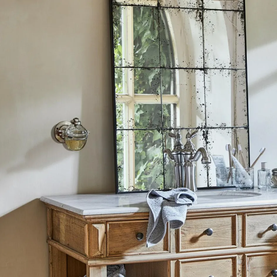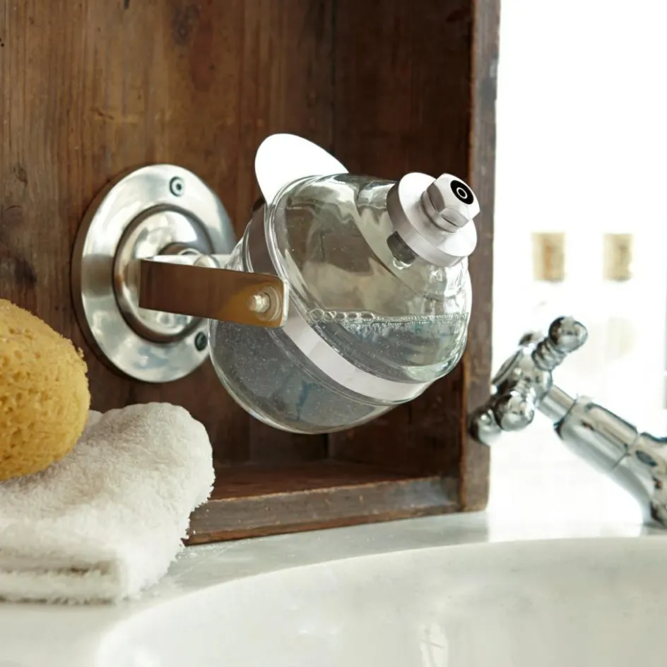 Dieser stilvolle Seifenspender zur Wandbefestigung ist ein Kunstwerk für Ihr Bad oder WC. Die schwenkbare Messinghalterung und der darin liegende, ovale Glasbehälter schaffen Platz am Waschbeckenrand – darüber hinaus sieht die Konstruktion im Retro-Look einfach gut aus. Das Behältnis hat ein Fassungsvermögen von etwa 400 ml. Der Dosierspender lässt sich abschrauben um so die Flüssigseife einfüllen zu können. Leicht zweckentfremdet ist der Seifenspender auch in der Dusche einsetzbar – als Behältnis für Shampoo oder Duschgel. Auch eine Idee: Als Spülmittelspender in der Küche. Um Korrosion zu vermeiden und die Lebensdauer des Seifenspenders zu verlängern, verwenden Sie bitte nur chloridfreie und pH-neutrale Flüssigseifen.