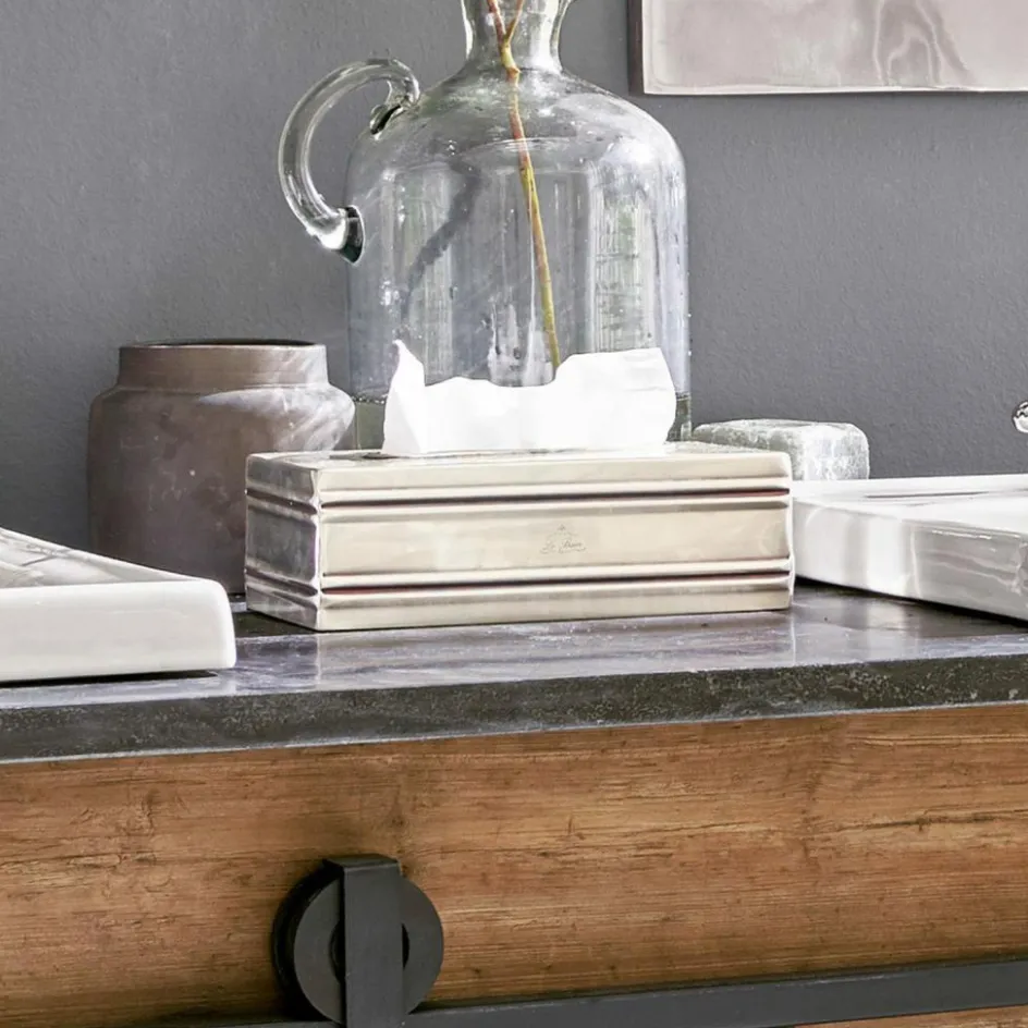 Mit dieser wunderschönen Box haben Sie Taschentücher oder Kosmetikpapier stets griffbereit. Die formschöne Box aus Edelstahl ist mit zwei eleganten Zierrillen sowie einer feinen Gravur „Le Bain“ versehen. Das zeitlos elegante Design passt sich hervorragend den Gegebenheiten an. Der Boden ist dabei offen. So schmückt dieses hilfreiche Accessoire Badezimmer oder andere Räume im klassisch gehaltenen Stil. Doch auch zu romantischen Einrichtungsstilen wie etwa dem Landhausstil oder dem französischen Country Chic passt die hübsche Box ausgezeichnet. Verbreitet elegantes Flair und wertet den Raum auf.