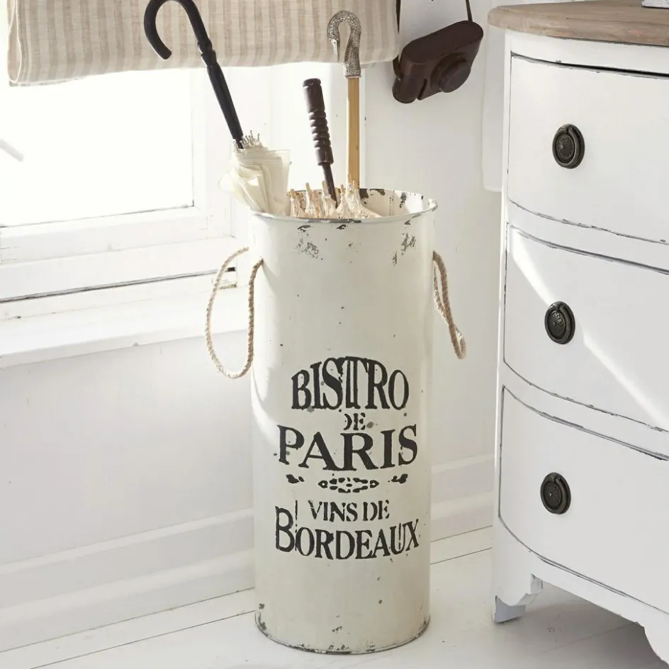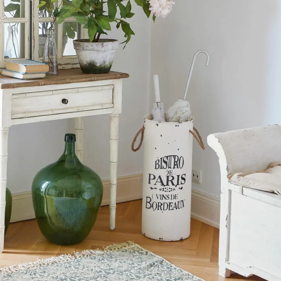 Ebenso praktisch wie dekorativ − das reizvolle Modell mit französischem Charme ist der ideale Aufbewahrungsort für Regenschirme, Walking-Stöcke oder auch Gehstöcke. Aus den Naturmaterialien Eisen und Jute entstand ein attraktives Design, das mit seinem stimmungsvollen Print das Flair Frankreichs in Ihr Zuhause zaubert. Das gekonnte Antik-Finish trägt zu dem Eindruck bei, es hier mit einem seltenen Fundstück vom Flohmarkt oder von einem geheimnisvollen Dachboden zu tun zu haben. Durch das Finish entsteht der charakteristische Look des Shabby-Chic mit feiner Vintage-Anmutung. An den seitlichen Henkeln aus Jute lässt das hübsche Modell sich ganz leicht verstellen. Durch die hohen, schmalen Maße findet es auch im kleinsten Raum Platz.