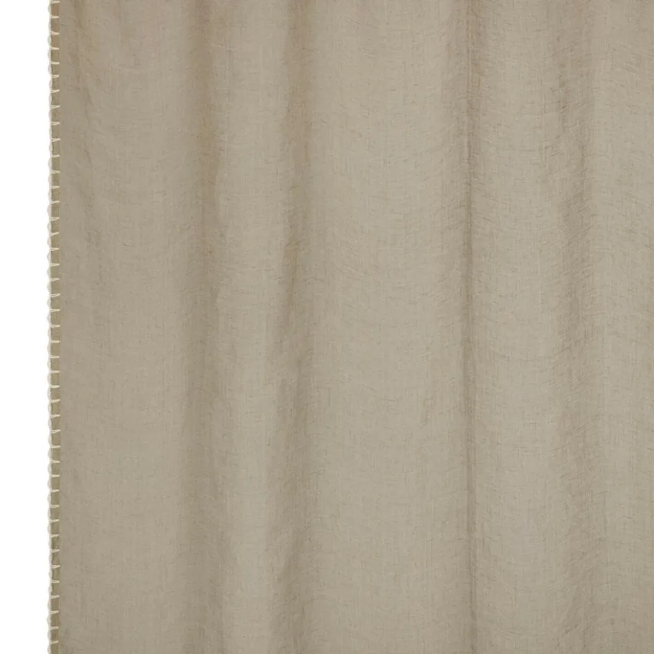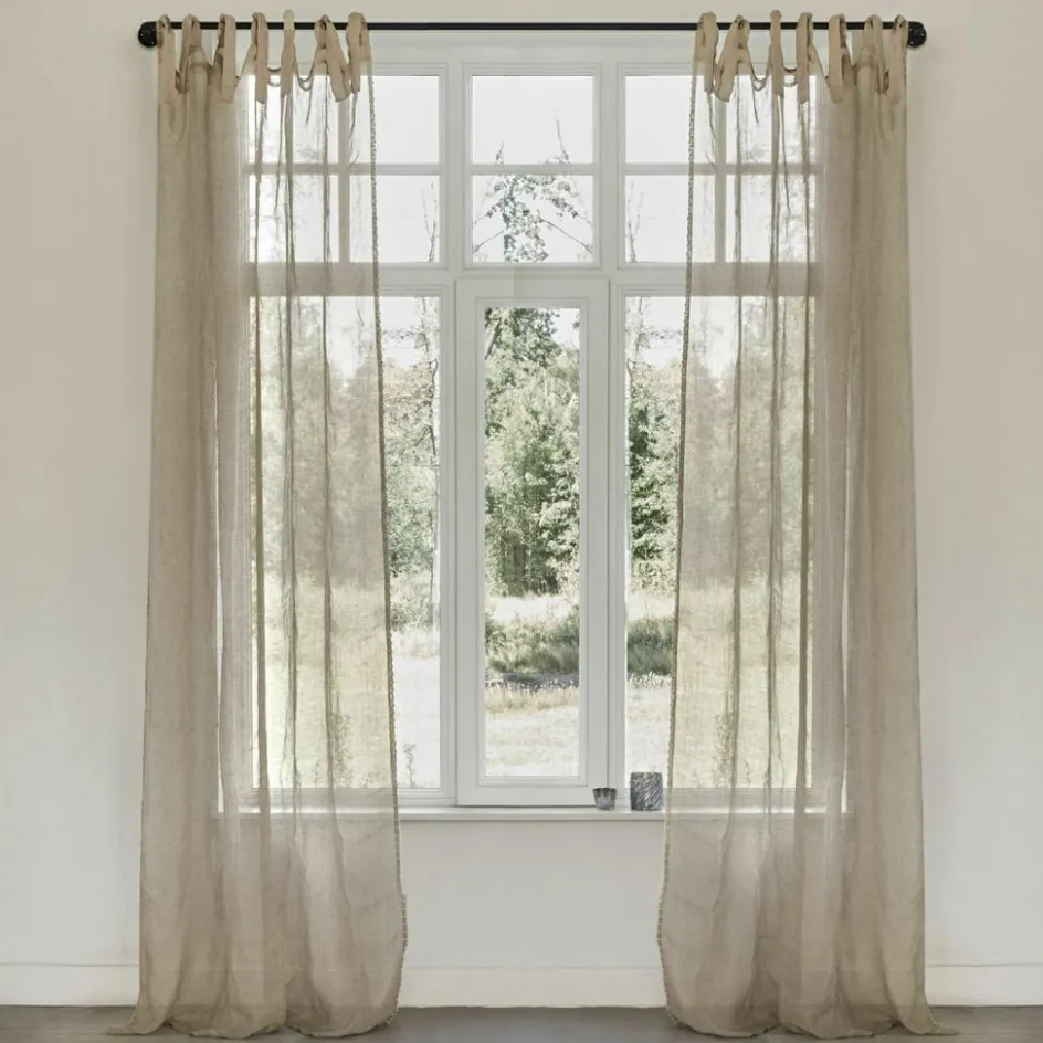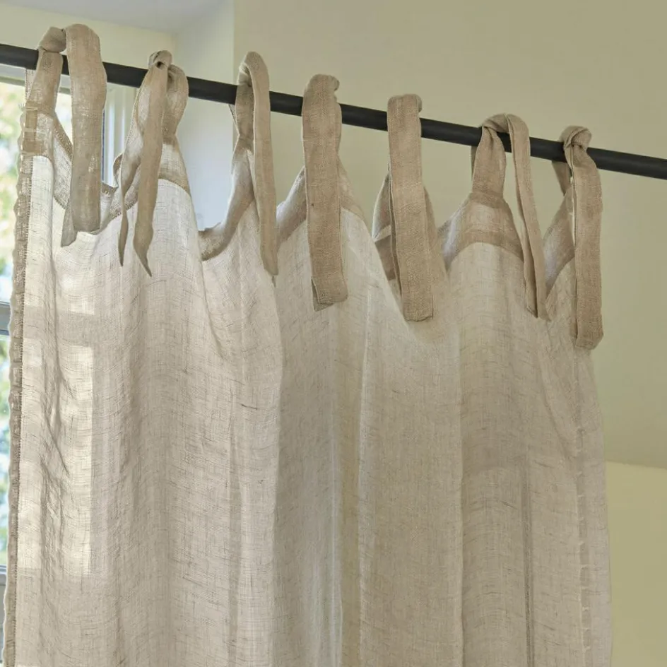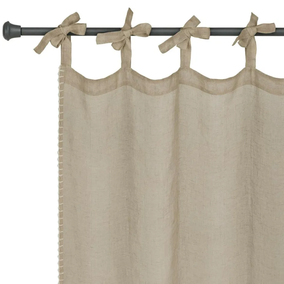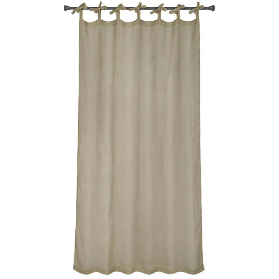 Manchmal sind es gerade die kleinen Unvollkommenheiten, die ein Stück besonders machen. Diese Gardine aus grob gewebtem Leinenstoff verleiht dem Raum eine wunderbar unaufgeregte Natürlichkeit – wie ein Fenster, das das Licht des Südens einfängt. Die locker fallende Struktur wirkt angenehm entspannt, die feine Häkelkante entlang des Randes bringt charmantes Detailhandwerk ins Spiel. Mit den Bindebändern lässt sich der Vorhang ganz individuell knoten – mal locker verspielt, mal auf den Punkt. Ein Wohntextil für alle, die Authentizität und handwerklichen Charakter lieben.