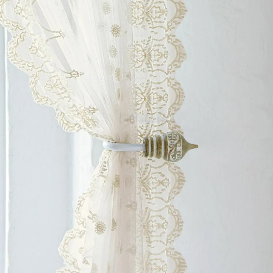 Das stabile Set besteht aus zwei Vorhanghaltern aus Eisen – die hölzernen Abschlüsse wurden aufwändig gedrechselt und mit einem cremefarbenen Vintage-Finish versehen. Die floralen Ornamente sind in Handarbeit entstanden und machen jedes Stück zu einem echten Unikat. Das Design der Vorhanghalter lässt sich mühelos mit verschiedenen Einrichtungsstilen ergänzen. Unser Tipp: Kombinieren Sie das 2er Set zur passenden Vorhangstange im gleich Stil.
