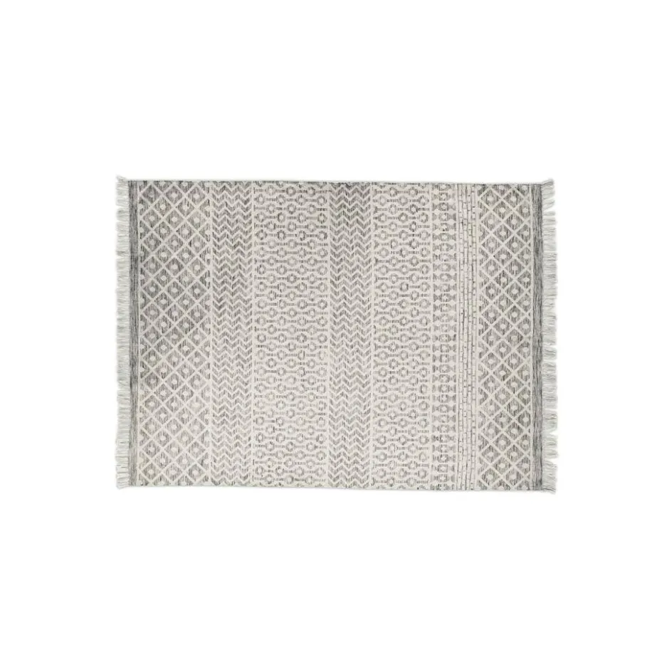 Wohntextilien bringen eine wunderbare Behaglichkeit in das Ambiente. Umso schöner, wenn sie so kombifreundlich und von nachhaltiger Qualität sind wie dieser exquisite Teppich. Ausschließlich wiederaufbereitete PET-Flaschen werden für seine Herstellung verwendet. Diese werden geschmolzen und zu Garn verarbeitet. Von einem gewebten Baumwollteppich ist er kaum zu unterscheiden. Denn er fühlt sich besonders weich an und der wunderschöne, plakative Mustermix in neutralen Farbtönen verleiht ihm die elegante Ausstrahlung. Jedoch ist er durch die Kunstfaser viel widerstandsfähiger, zugleich schnell trocknend und wasserabweisend, so dass er nicht nur für viel genutzte Innenräume wie Bad oder Esszimmer ideal einsetzbar ist, sondern auch für den Außenbereich wie zum Beispiel auf der Terrasse oder im Pavillon. Dekorative Fransen an den schmalen Kanten runden den Webteppich ab. So schön lässt sich Wohnluxus zeitgemäß interpretieren.
