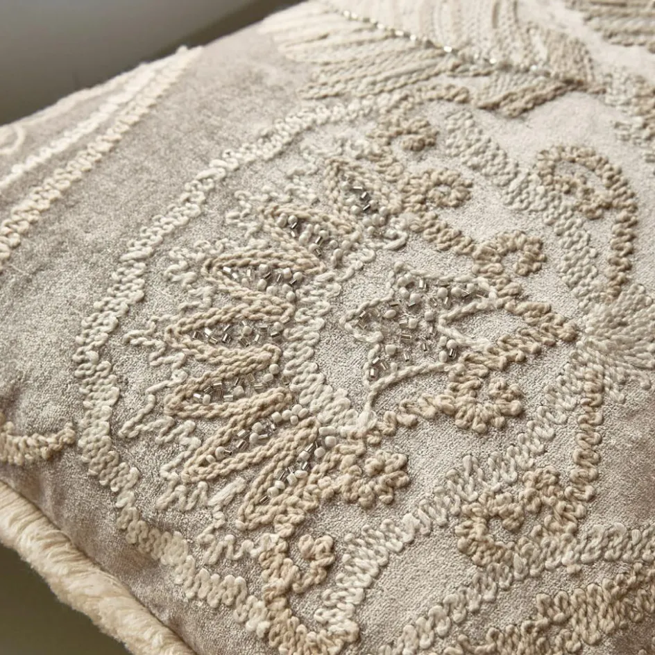 Erleben Sie den ultimativen Luxus mit diesem beeindruckenden Set aus zwei Kissenhüllen, die in jeder Hinsicht die Perfektion des Handwerks betonen. Diese Kissenhüllen sind aus schimmerndem Viskosesamt gefertigt und fangen das Licht ein, das die kunstvollen Stickereien in einem blendenden Spiel von Licht und Schatten hervorhebt. Die weiche Baumwolle auf der Rückseite sorgt für ein angenehmes Hautgefühl, während die sorgfältig angebrachten Fransen an den Seiten jedes Kissen zu einem echten Blickfang machen. Ideal für jeden, der sein Zuhause mit einem Hauch von klassischer Eleganz und zeitloser Schönheit bereichern möchte.
