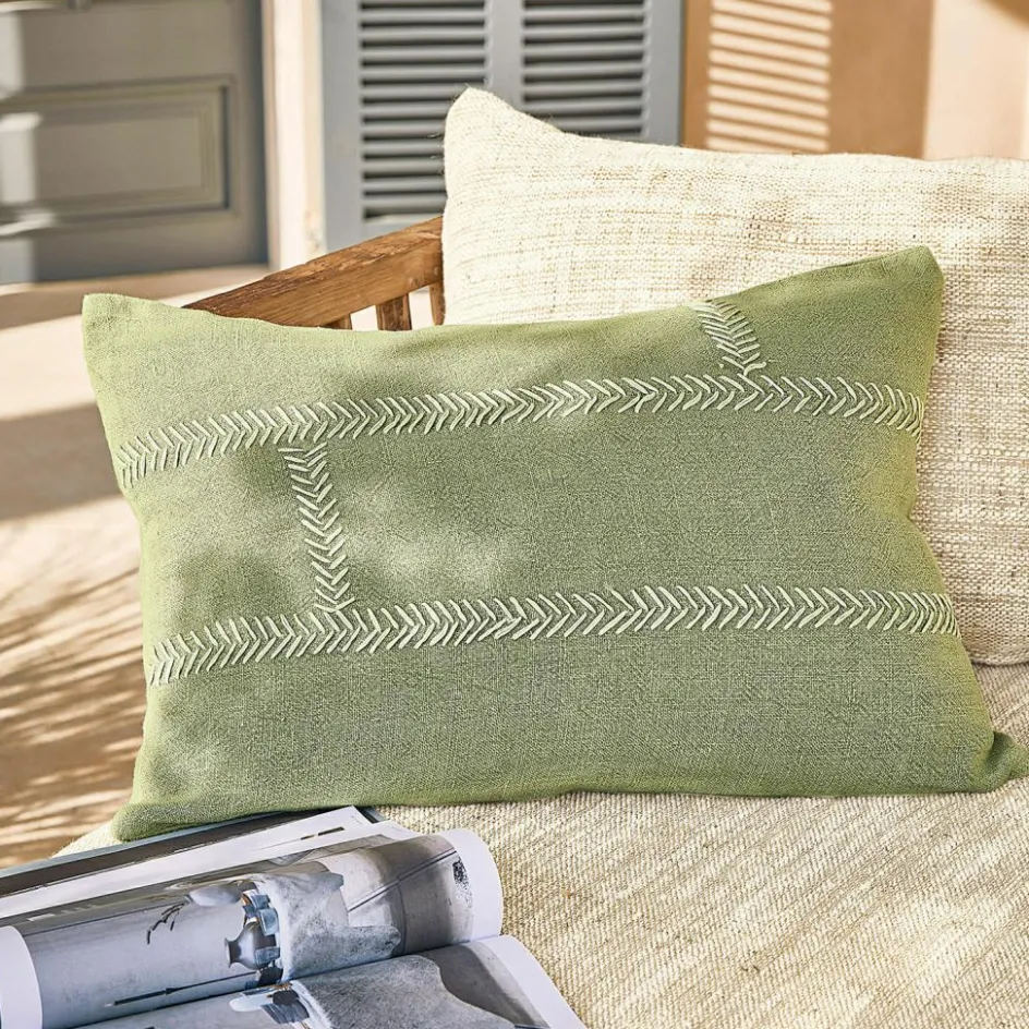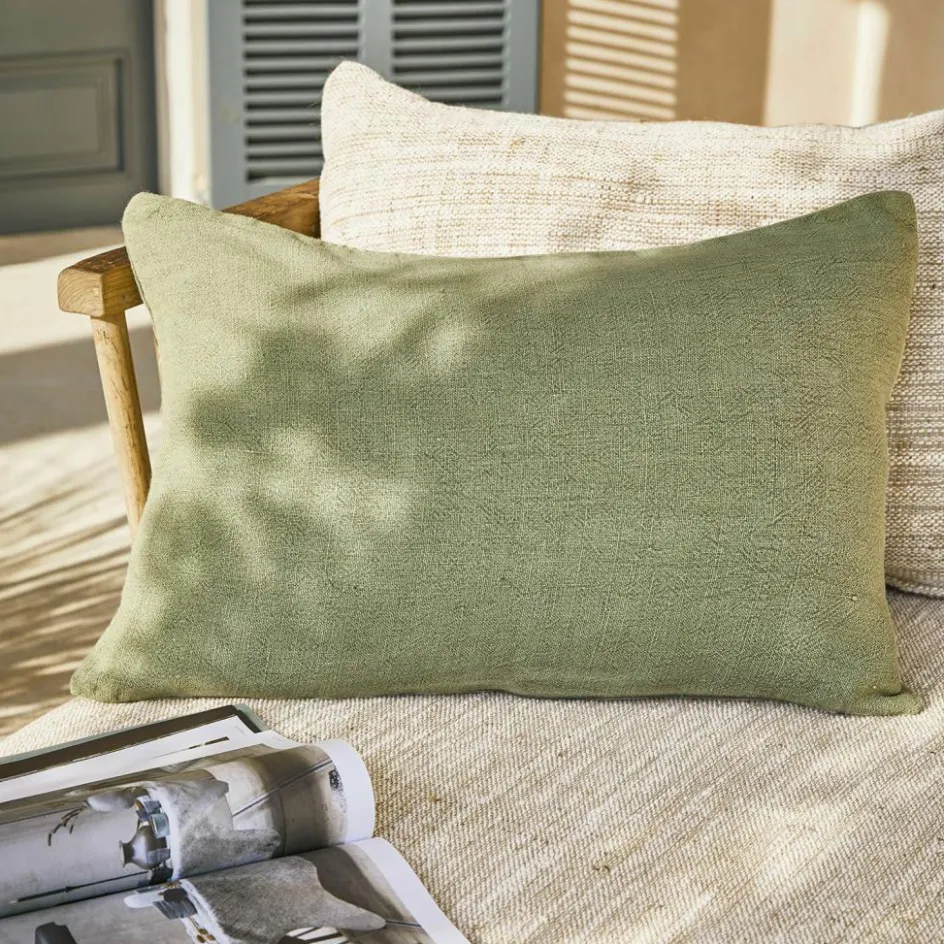 Wohn-Accessoires aus reinem Leinen wirken immer edel. Und wenn die Naturfaser so aufwendig verarbeitet wurde wie hier, kann aus einer kleinen Kissenhülle ein stylischer Hingucker werden. Für das gewisse Etwas sorgen bei dieser Kissenhülle die auffälligen Nähte im Handmade-Look, die betont unregelmäßig ausgeführt wurden und der Hülle eine zwanglose Lässigkeit verleihen, wie sie perfekt zu einem entspannten Sommerwochenende unter freiem Himmel passt. Gleichzeitig verwöhnt die Naturfaser Sie mit ihrer einzigartigen Haptik. Denn die Oberfläche fühlt sich angenehm glatt und kühl an, zeigt zugleich aber auch die typische, leicht unregelmäßige Webstruktur mit dem dezenten Glanz. Der sanfte Grünton der Kissenhülle unterstreicht die natürliche Ausstrahlung und harmoniert wunderschön mit den Pflanzen neben Ihrer Terrasse. Und wenn später am Abend ein kühles Lüftchen durch den Garten weht, hüllen Sie sich in das passende Plaid (22031), während das Kissen Ihren Rücken stützt. Die Kissenhülle hat einen Reißverschluss und kann wie das Plaid bei Bedarf gewaschen werden.