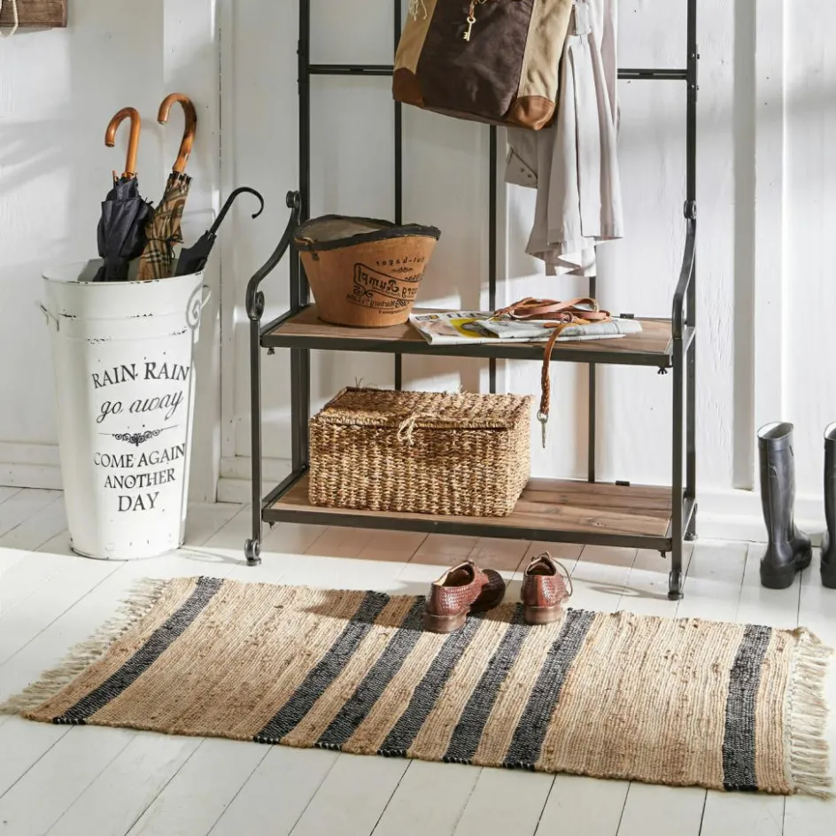 Für ein angenehmes Ambiente im Raum mit einem natürlichen Akzent sorgt dieses ansprechende Stück im zeitlos schönen Design. Gefertigt ist es aus dem hochwertigen Naturmaterial Hanf. Dieses fühlt sich nicht nur äußerst angenehm auf der Haut an und verlockt dazu, barfuß durch die Wohnung zu laufen, es ist auch langlebig und ein nachhaltiger Rohstoff. Die Hanfpflanze ist anspruchslos und wächst schnell nach. Zudem kann sie fast überall angebaut werden und lässt sich mehrfach recyceln. Somit ist das schöne Teil wunderbar für Wohnungen mit Accessoires aus Naturmaterialien geeignet. Die Ränder des Teppichs schmücken zarte Fransen. Ansprechende, garngefärbte Streifen in einem dunkleren Ton verleihen dem Gewebe im angenehmen Naturton einen zeitlos schönen Akzent. In der Küche, im Flur oder Eingangsbereich oder im Wohnzimmer ist das Teil ein sehr harmonischer Hingucker, der eine gewisse Ruhe ausstrahlt. Auch vor dem Bett ist er mehr als nur ein schöner Blickfang. Direkt nach dem Aufstehen ist es angenehm, mit den Füßen auf das hautsympathische Material zu steigen. So beginnt der Tag ganz entspannt mit einem guten Gefühl. Doch ganz gleich wo im Haus das zauberhafte Accessoire seinen Charme spielen lassen darf – Freude bereitet es garantiert. Ob zum Long-Island- oder zum Landhaus-Stil, zu Interior mit naturnaher Note oder zu rustikaler Einrichtung, dieses Piece fügt sich ganz harmonisch in den Raum ein und zieht die Blicke auf sich.