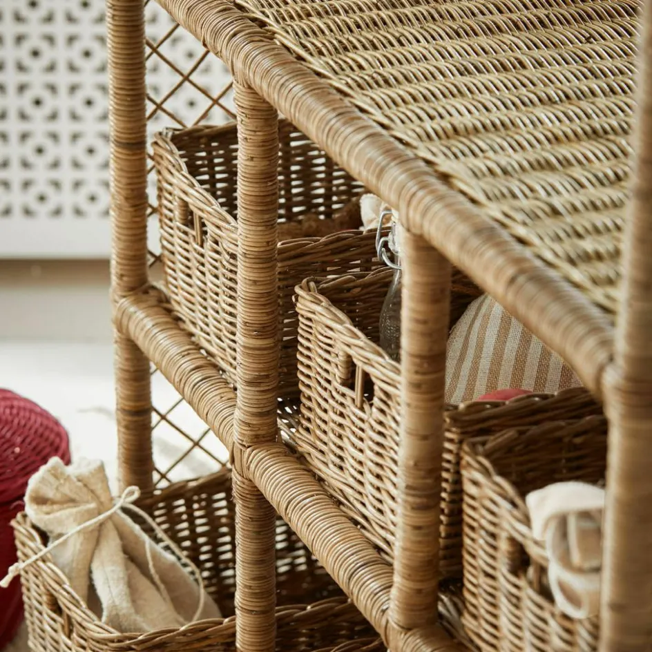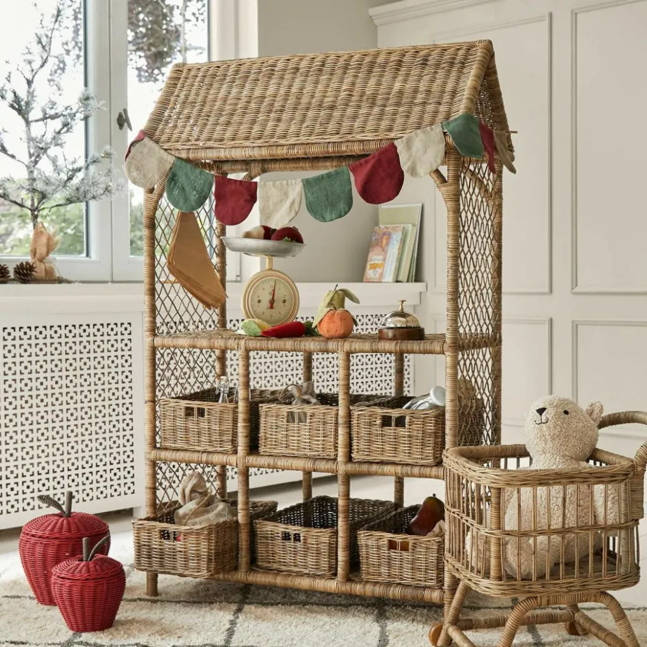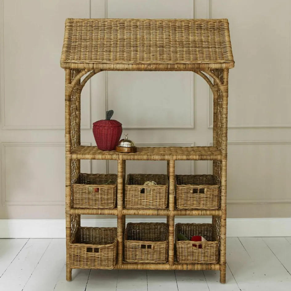Ob als Marktstand, Mini-Bäckerei oder Blumenladen – dieser charmante Kaufladen aus naturfarbenem Rattan macht jede Spielidee lebendig. Die liebevolle Flechtstruktur verleiht dem Möbelstück nicht nur Leichtigkeit, sondern auch eine besonders wohnliche Ausstrahlung. Die insgesamt sechs offenen Fächer bieten ausreichend Platz für Spielwaren, kleine Körbe oder fantasievolle Waren. Das leicht geneigte Dach unterstreicht den klassischen Markthütten-Stil und schafft sofort ein Gefühl von Gemütlichkeit und Geborgenheit. Dank seines geringen Gewichts lässt sich der Kaufladen problemlos verschieben – ideal für Kinder, die gerne immer wieder neue Welten erfinden.